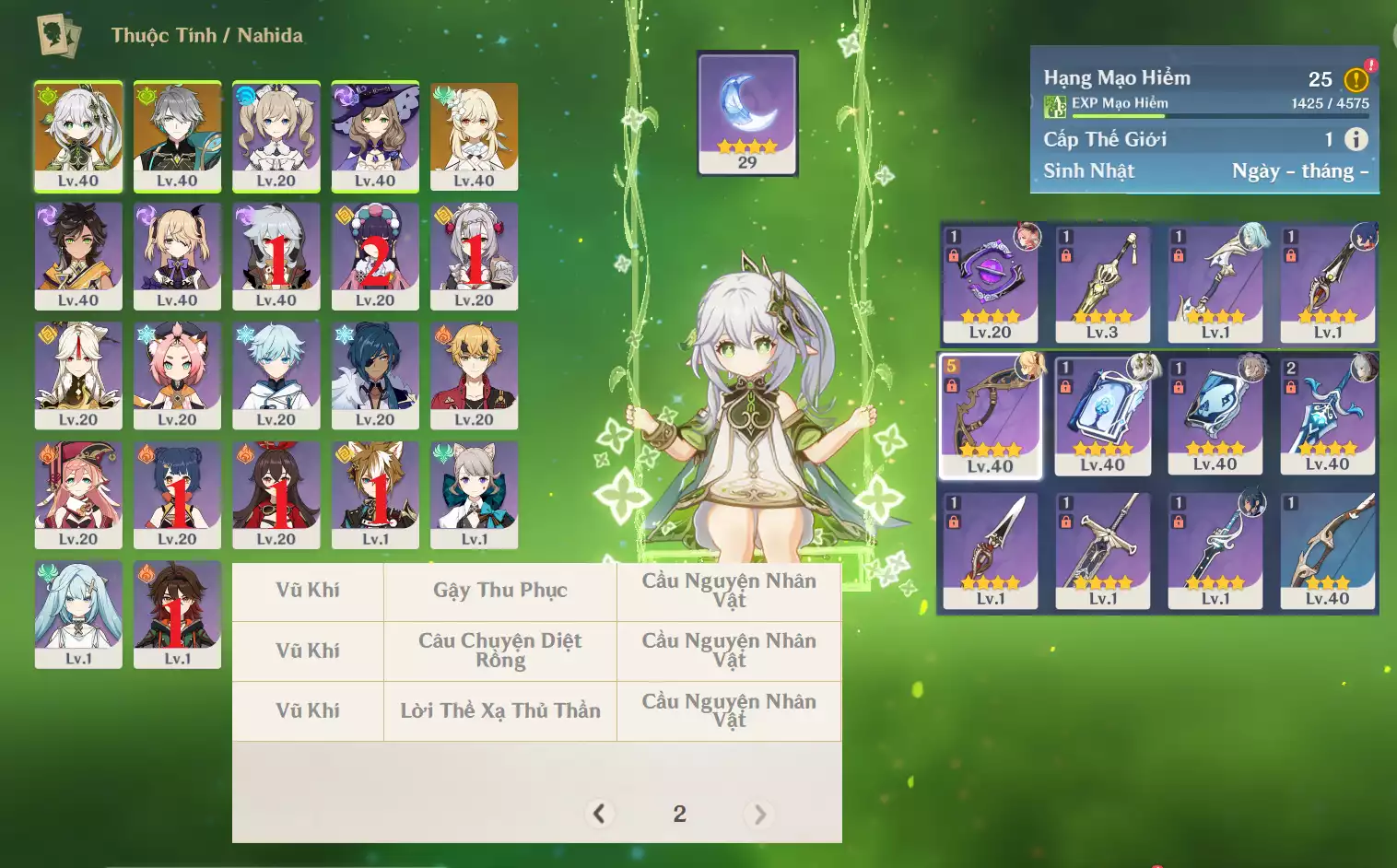 #355267 599,000đ 599,000đ AR level 25 Khu Vực asia Tướng 5* 2 Ar25 : Team thảo Nahida + Alhaitham , banner nhân vật 9 trang , chưa set sinh nhật Tướng : 2 Vũ khí : 0 Chi tiết