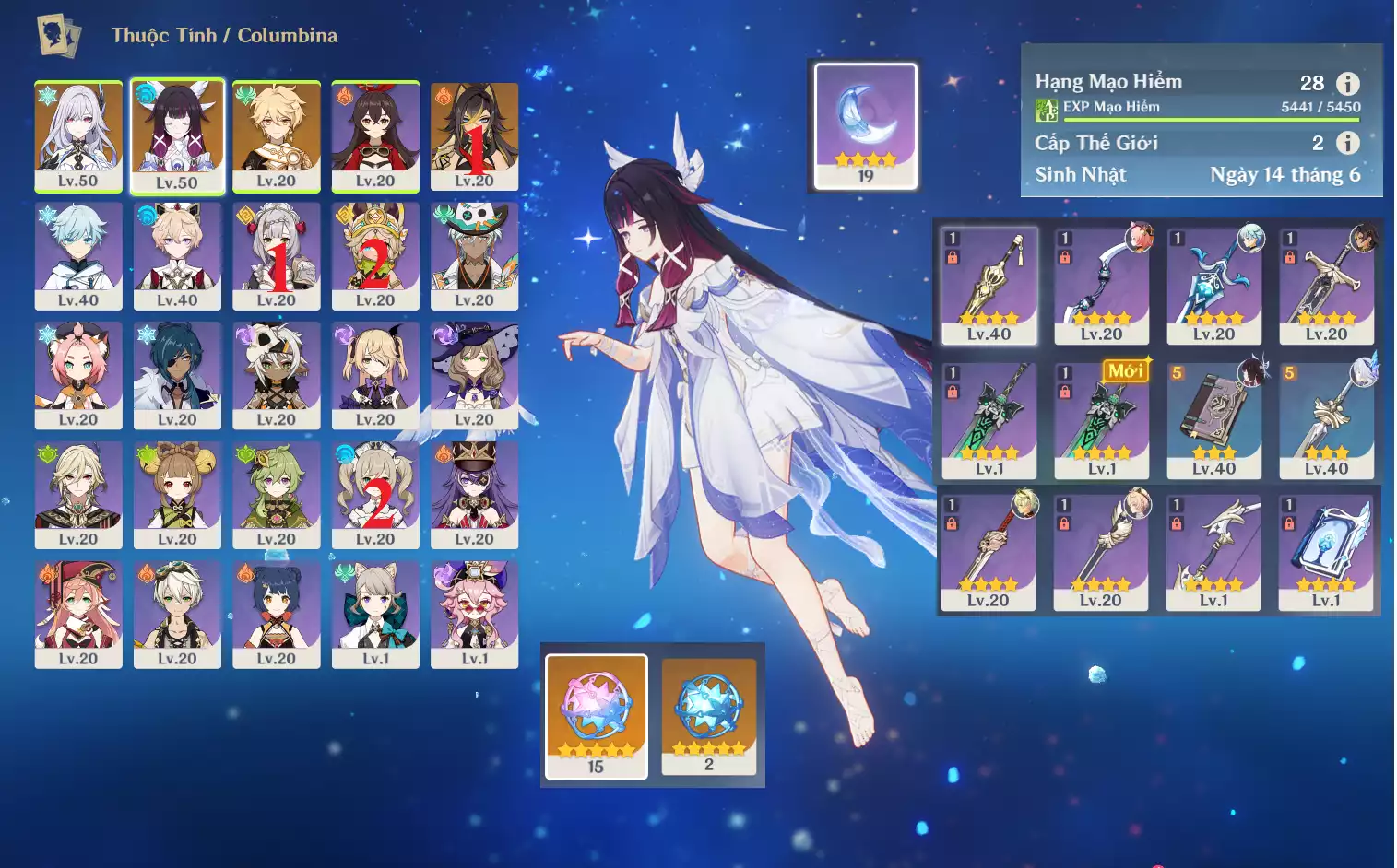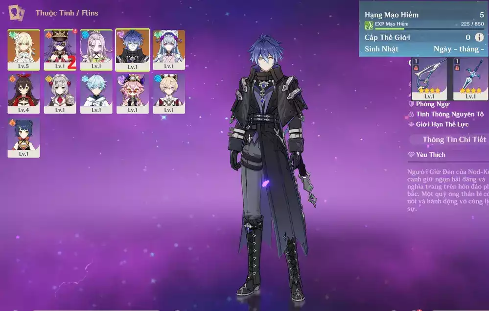 #359041 600,000đ 600,000đ AR level 5 Khu Vực asia Tướng 5* 1 Ar5: Nguyệt thần Columbina + Diluc main NAM , + 10 roll hồng , chưa set user _ chưa set sinh nhật Tướng : 1 Vũ khí : 0 Chi tiết
