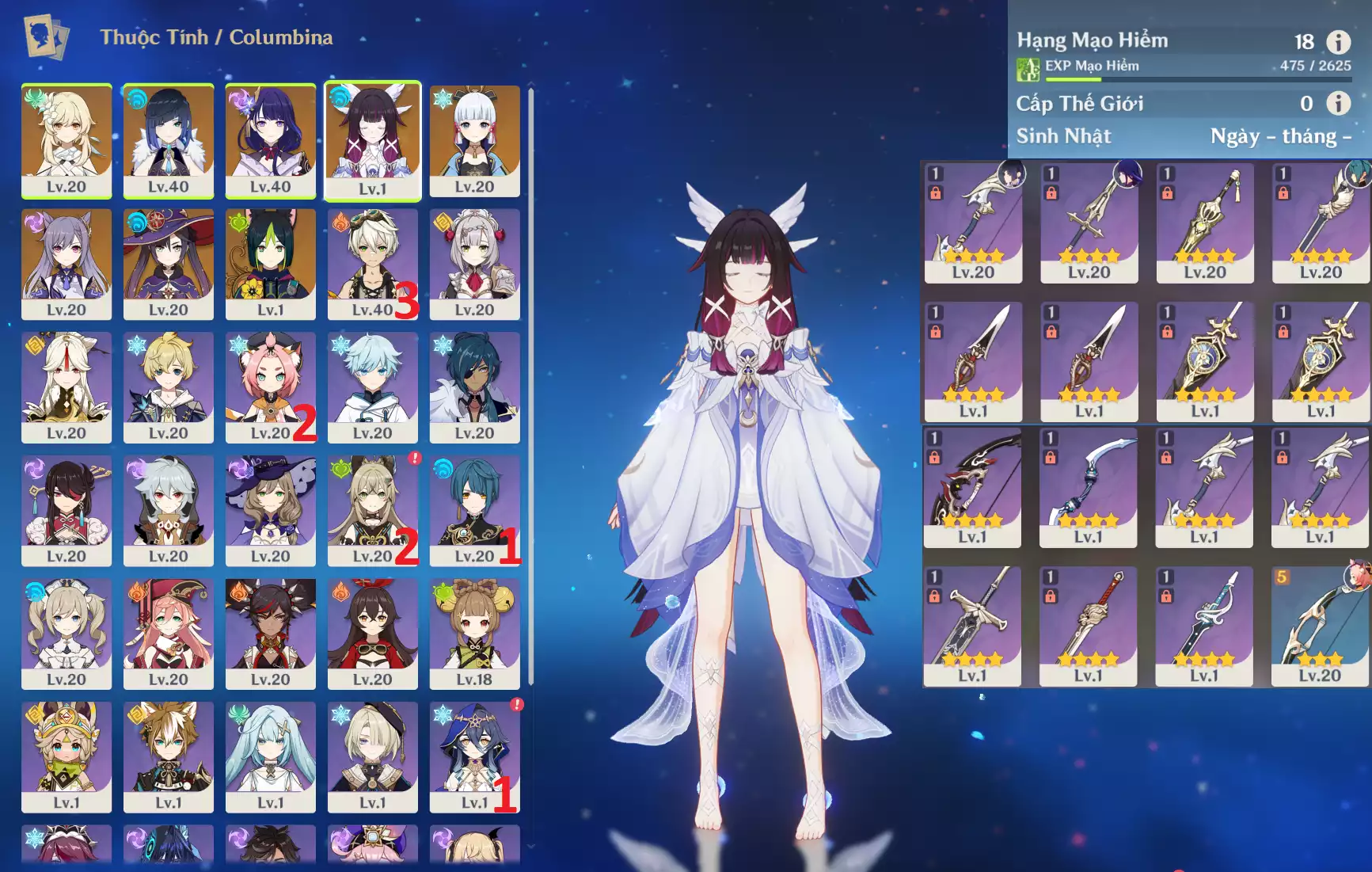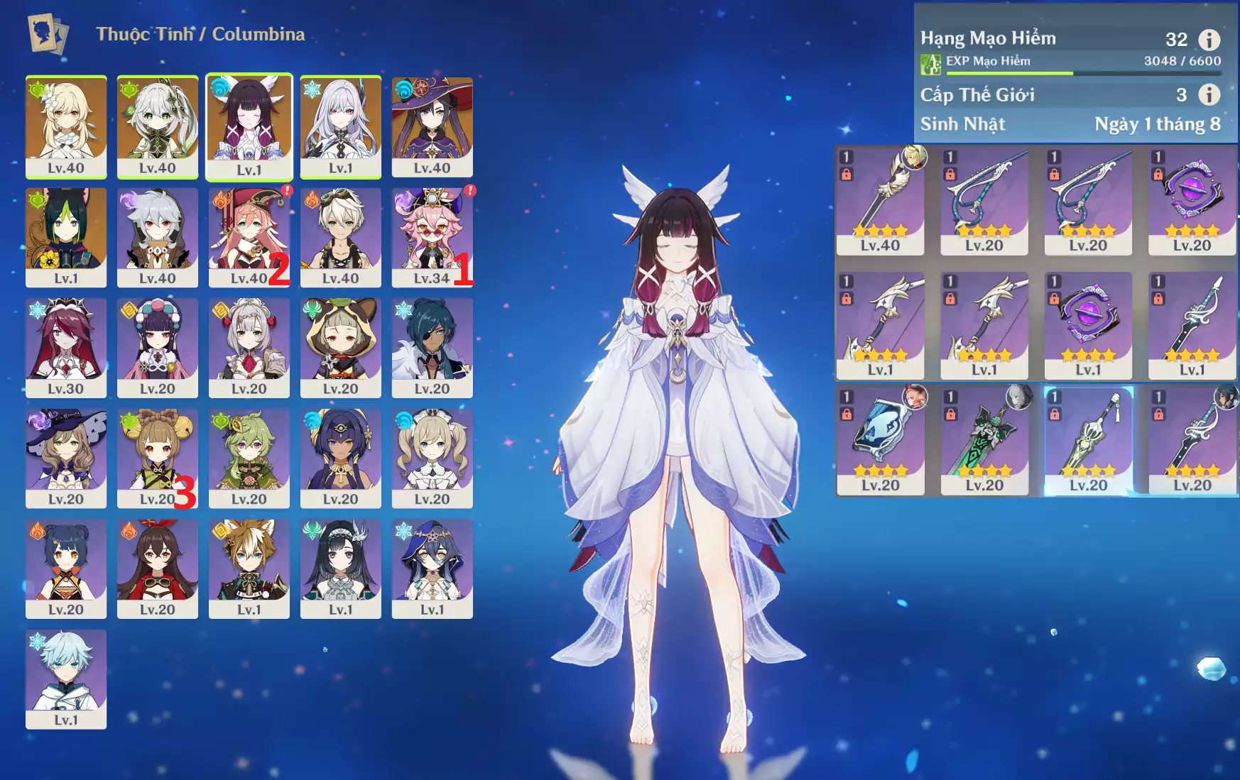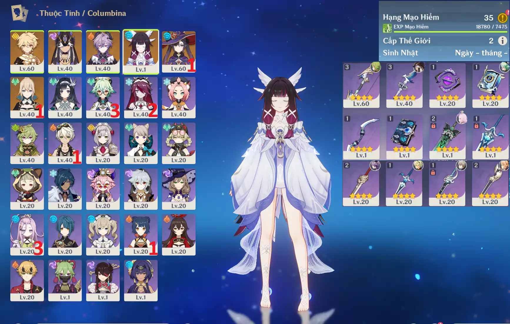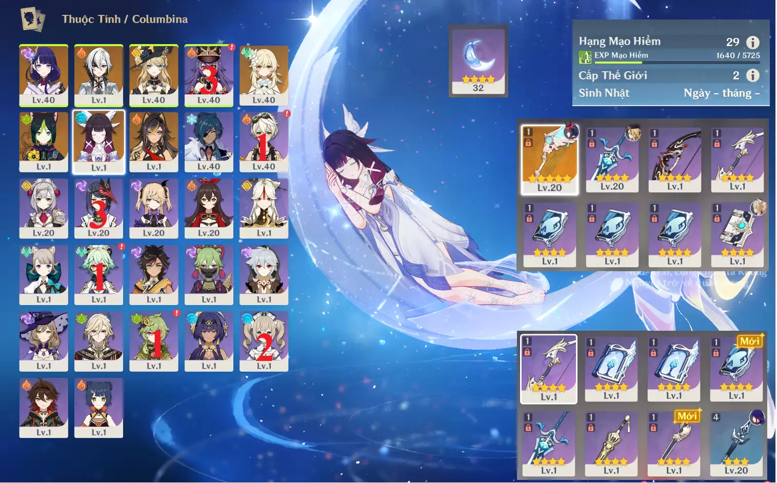 #358835 899,000đ 899,000đ AR level 35 Khu Vực asia Tướng 5* 5 Ar35 : Columbina + Durin + Cyno + MonaC1 + JeanC1 _ banner nhân vật 2 trang (chưa set sinh nhật ) _ map zin 90% Tướng : 5 Vũ khí : 0 Chi tiết