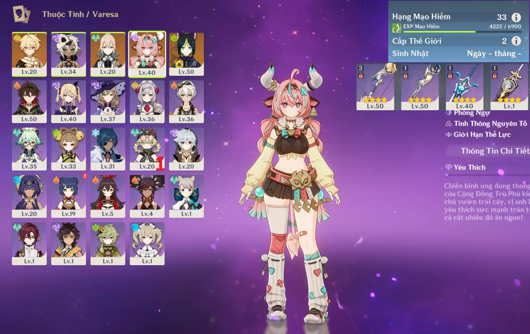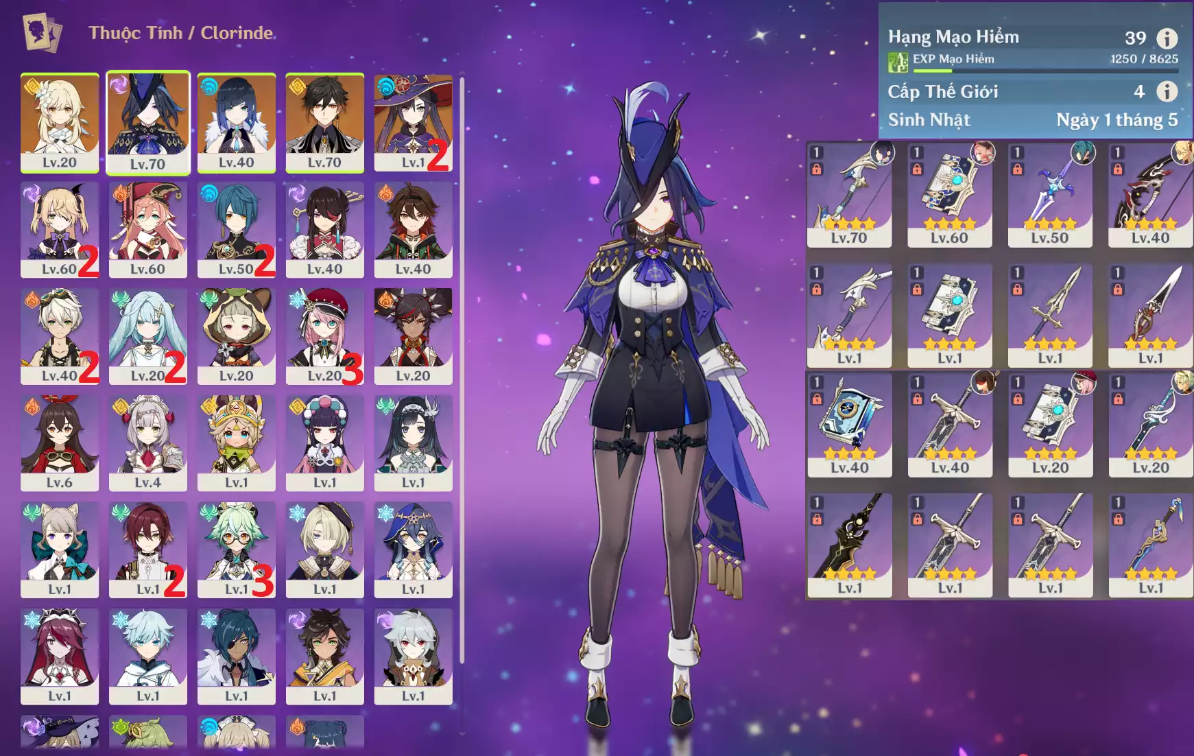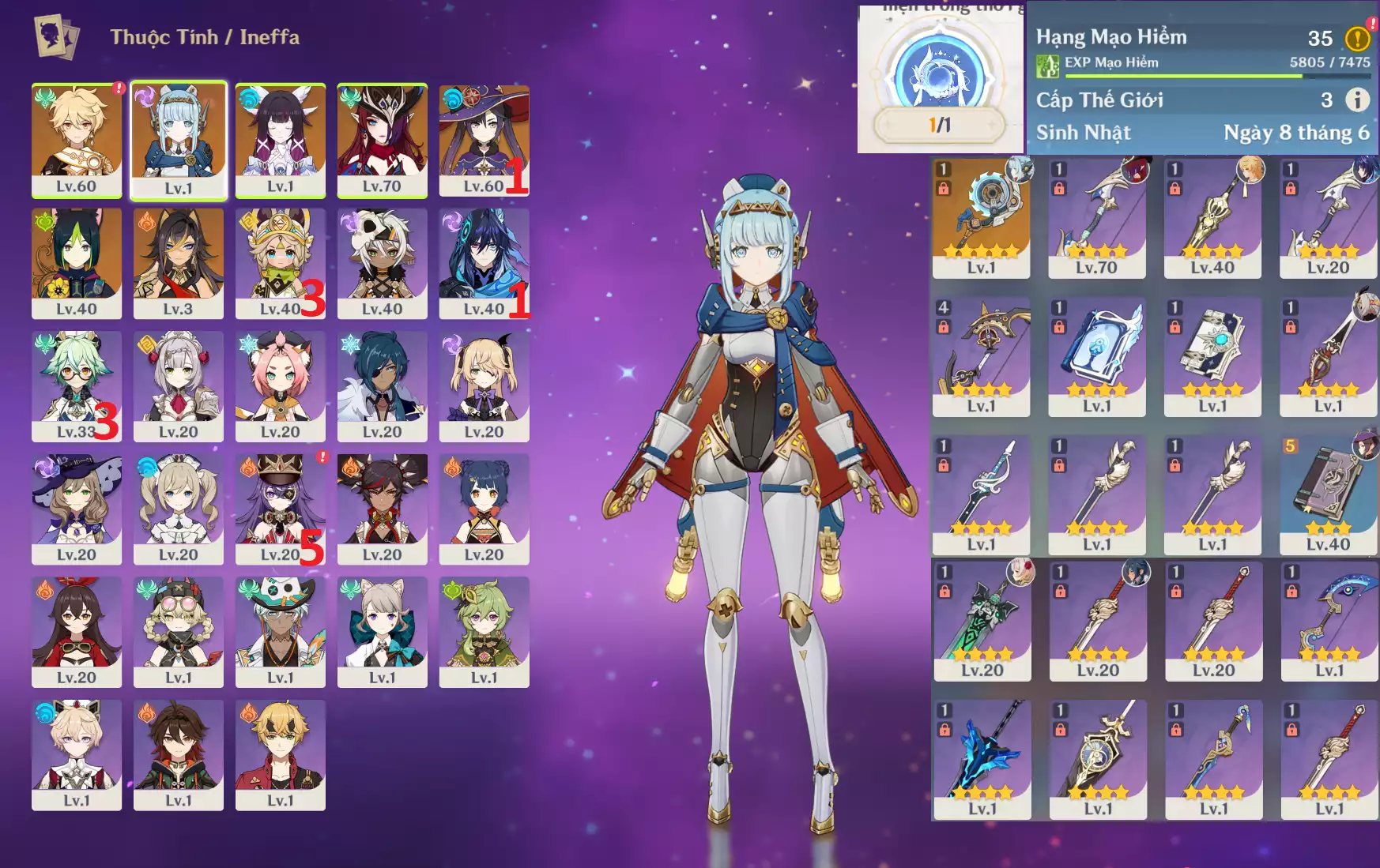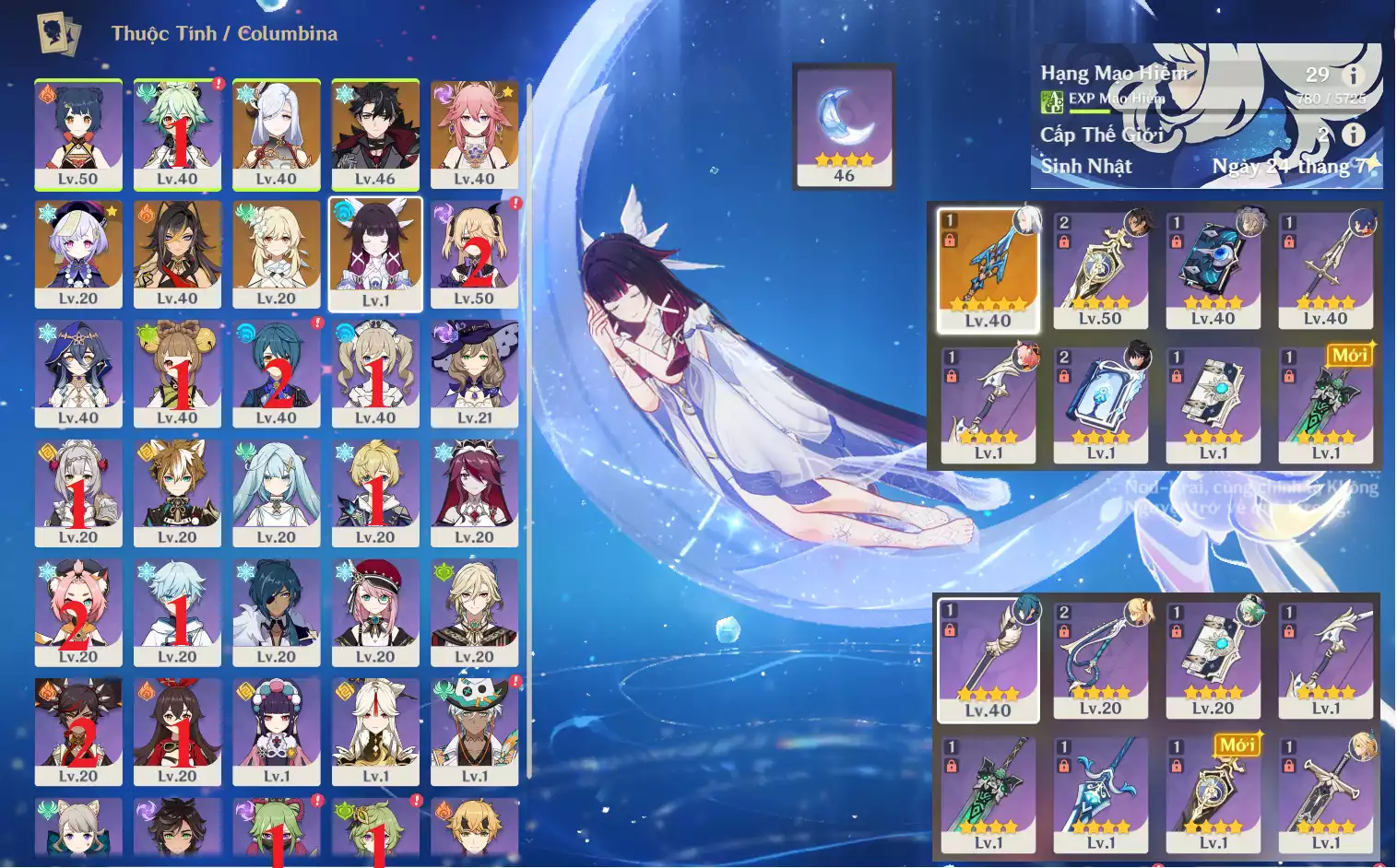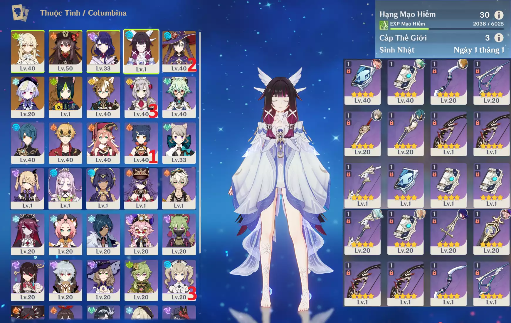 #358835 899,000đ 899,000đ AR level 35 Khu Vực asia Tướng 5* 5 Ar35 : Columbina + Durin + Cyno + MonaC1 + JeanC1 _ banner nhân vật 2 trang (chưa set sinh nhật ) _ map zin 90% Tướng : 5 Vũ khí : 0 Chi tiết