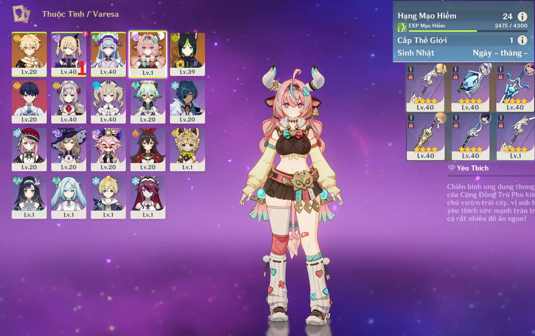 #358857 1,300,000đ 1,300,000đ AR level 25 Khu Vực asia Tướng 5* 5 Ar25 : Columbina + Raidenshogun-baal + Nahida + Xianyun + Tighnari_ bennetC4 xiangling fischl _ banner nhân vật 2 trang ( chưa set sinh nhật ) Tướng : 5 Vũ khí : 0 Chi tiết