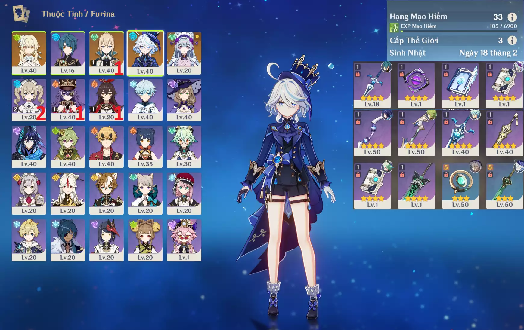 #361365 329,000đ 329,000đ AR level 33 Khu Vực asia Tướng 5* 3 Ar33 : Furina + JeanC1 + Mizuki _ banner nhân vật 55/90 ( quên user ) _ map zin 95% Tướng : 3 Vũ khí : 0 Chi tiết