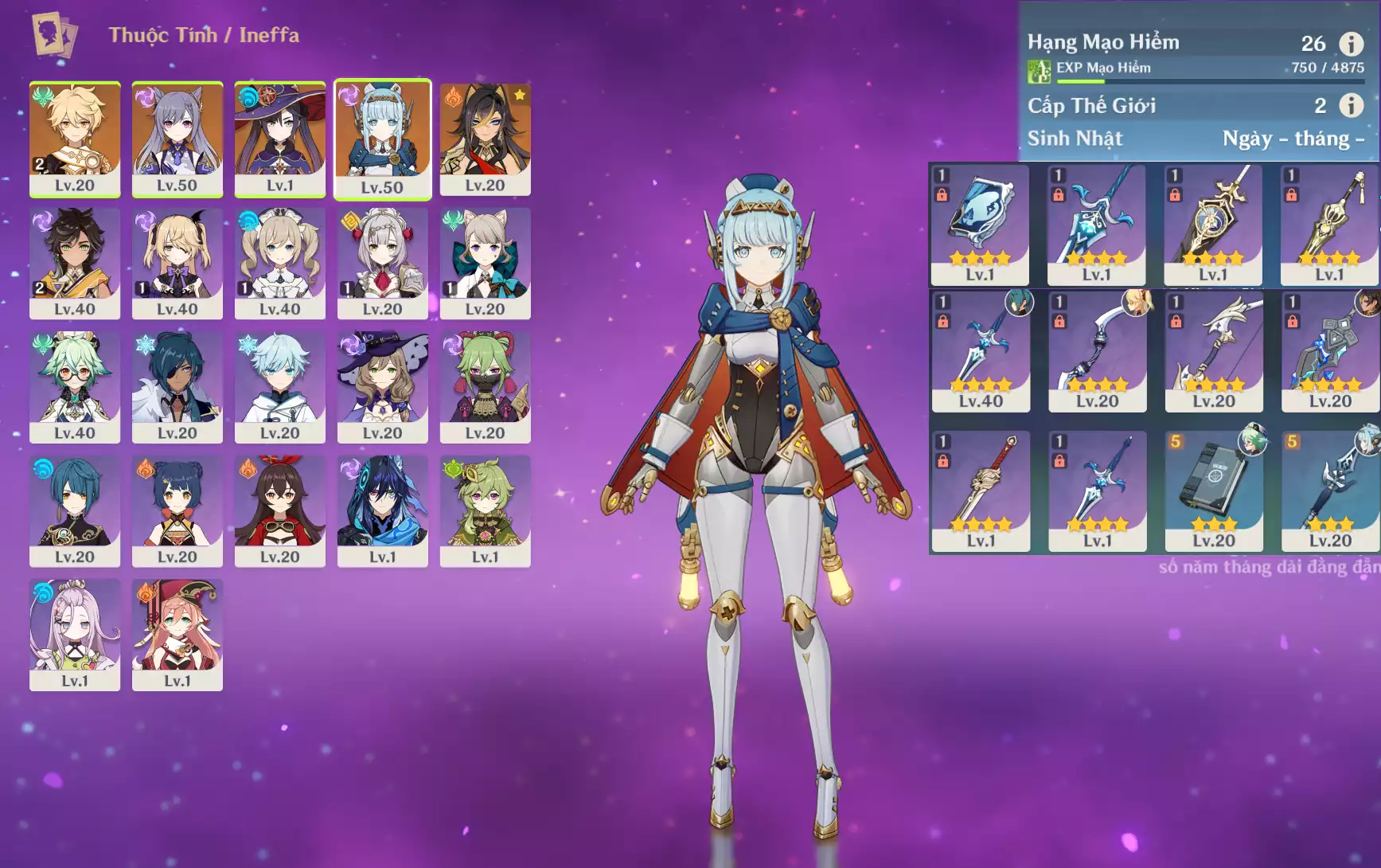 #361368 399,000đ 399,000đ AR level 26 Khu Vực asia Tướng 5* 4 Ar26 : Ineffa + Mona + Keqing + Dehya _ banner nhân vật ĐÃ LỆCH 25/90 ( chưa set user + sinh nhật ) Tướng : 4 Vũ khí : 0 Chi tiết