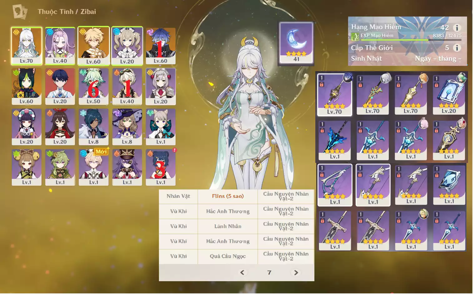 #361358 599,000đ 599,000đ AR level 42 Khu Vực asia Tướng 5* 4 Ar42: Flins cung mệnh 1 + Zibai + Tighnari bennetC1 Main NAM , banner nhân vật 7 trang , chưa set sinh nhật , quên user Tướng : 4 Vũ khí : 0 Chi tiết