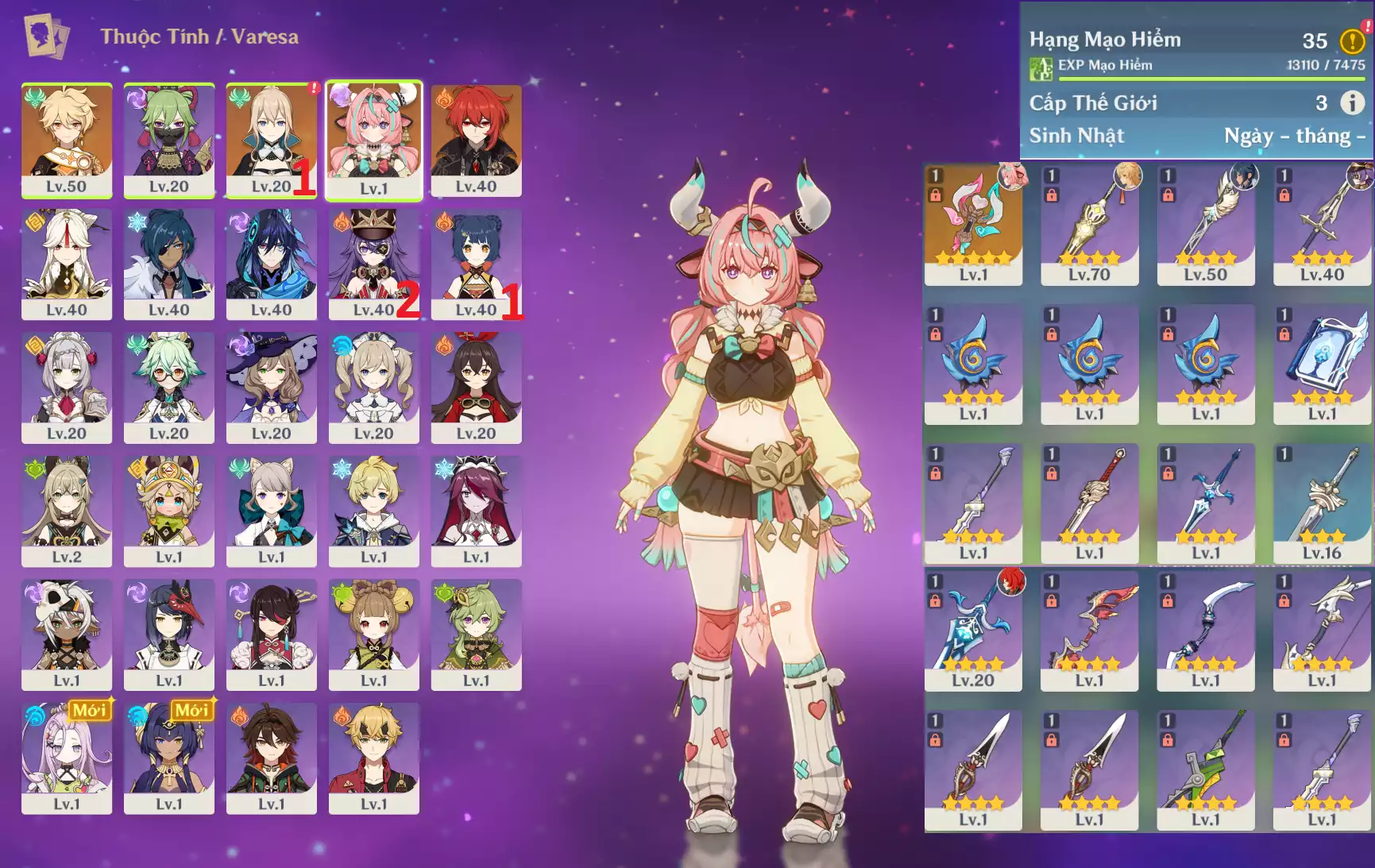 #356536 699,000đ 699,000đ AR level 21 Khu Vực asia Tướng 5* 6 Ar21 : Varesa + Mualali + QTK + Tighnari + Dehya + Mona + Keqing _ banner nhân vật 20/90 (chưa set user + sinh nhật ) Tướng : 6 Vũ khí : 1 Chi tiết