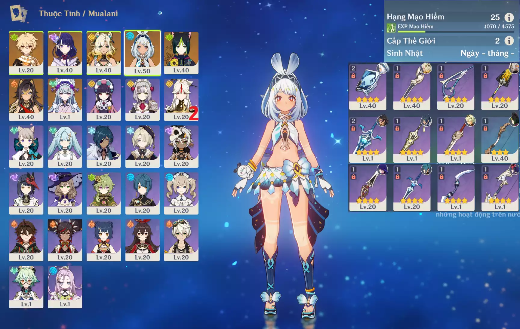 #356539 800,000đ 800,000đ AR level 25 Khu Vực asia Tướng 5* 6 Ar25 : Raidenshogun-baal + Mualali + Xilonen + Tighnari + Dehya + Mizuki _ banner nhân vật ĐÃ LỆCH 30/90 ( chưa set user + sinh nhật ) Tướng : 6 Vũ khí : 0 Chi tiết