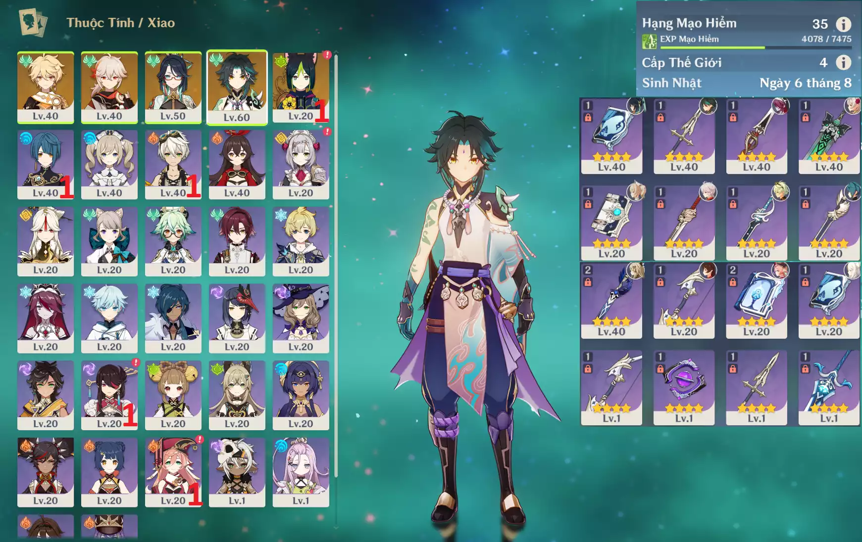 #356554 600,000đ 600,000đ AR level 35 Khu Vực asia Tướng 5* 6 Ar35 : Xiao + Xianyun + Kazuha + TighnariC1 _ bennetC1 xingqiuC1 _ banner nhân vật 40/90 lần. Tướng : 6 Vũ khí : 0 Chi tiết