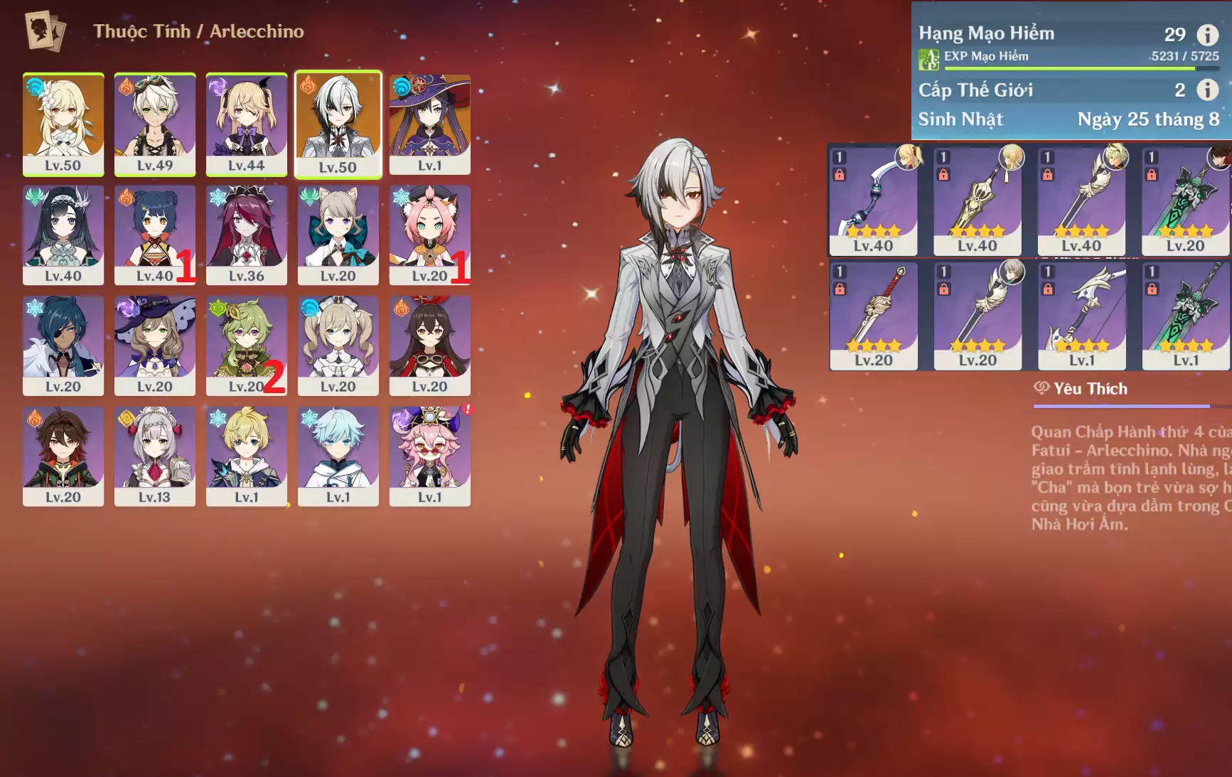 #356559 449,000đ 449,000đ AR level 29 Khu Vực asia Tướng 5* 3 Ar29 : Arlecchino + Mona _ bennet xianglingC1 _ banner nhân vật 60/90 lần. Tướng : 3 Vũ khí : 0 Chi tiết