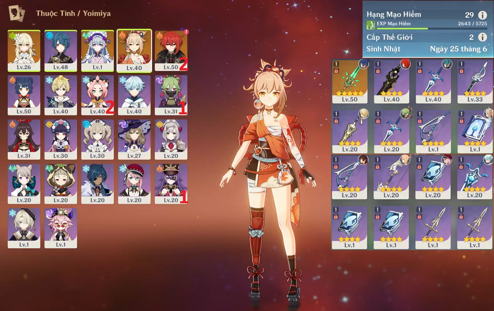#356535 250,000đ 250,000đ AR level 29 Khu Vực asia Tướng 5* 4 Ar29 : Yoimiya + Diluc cung mệnh 2 + Mizuki + HPD xingqiu_ banner nhân vật ĐÃ LỆCH 1 trang ( chưa set sinh nhật ) Tướng : 4 Vũ khí : 1 Chi tiết