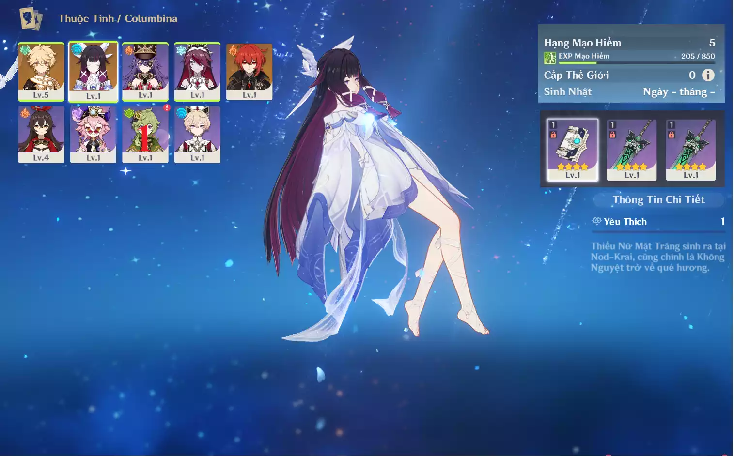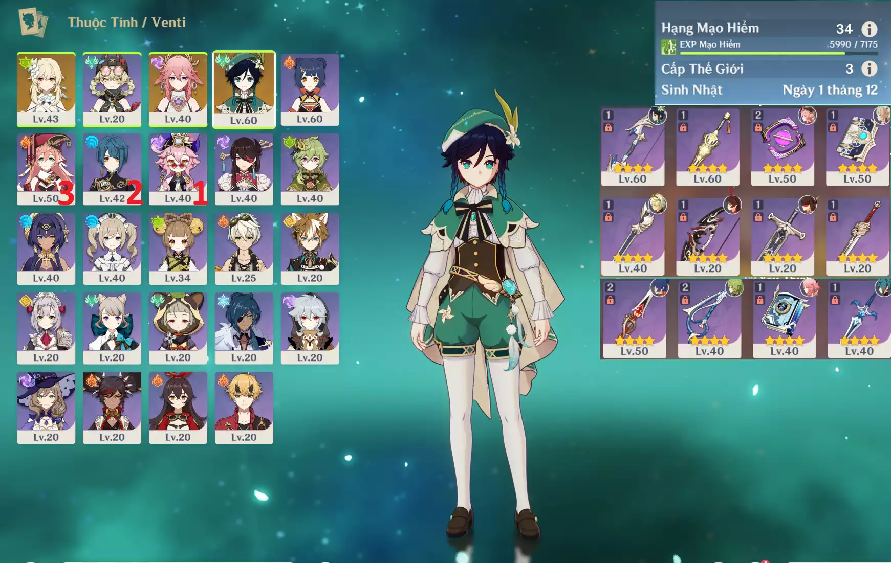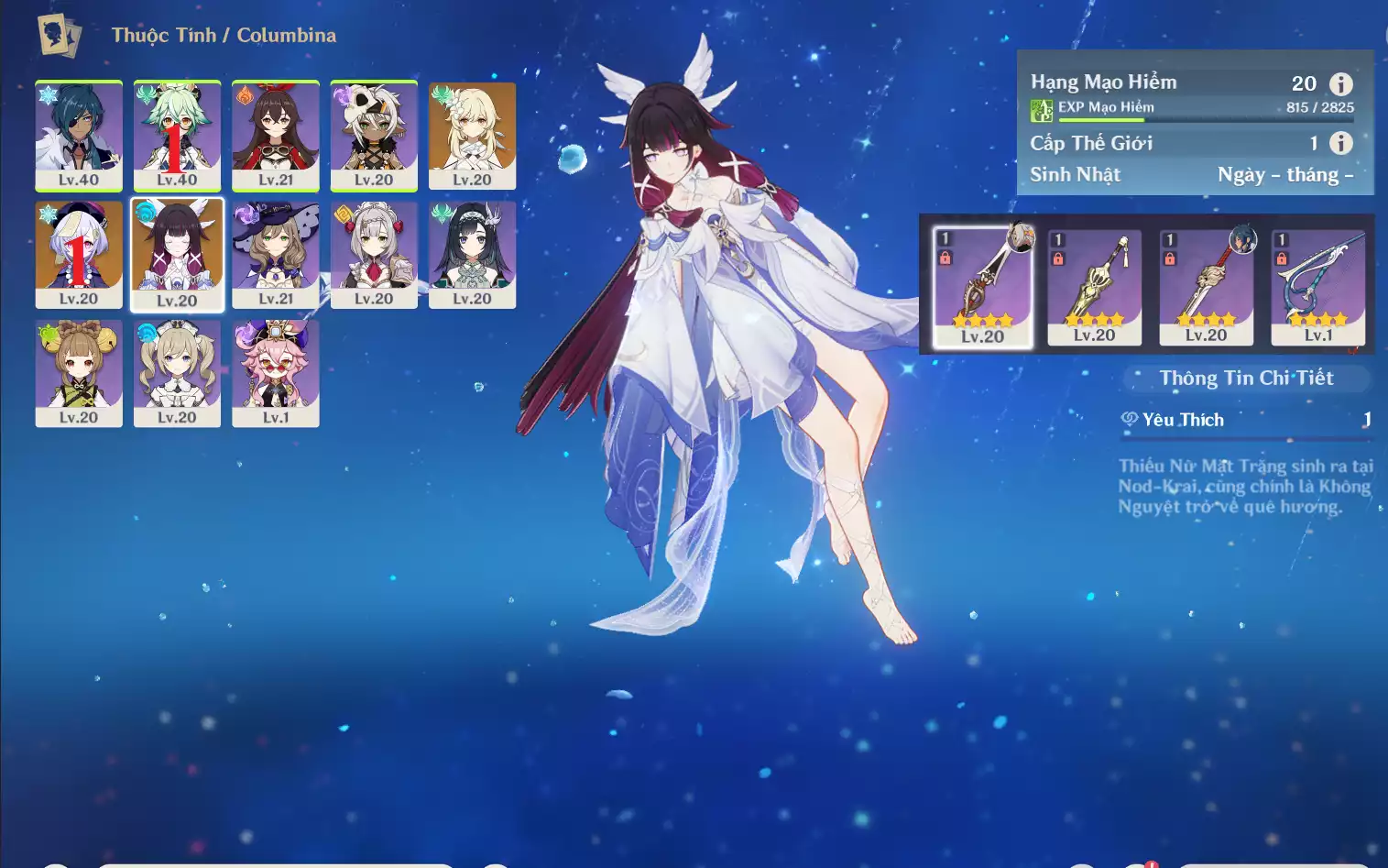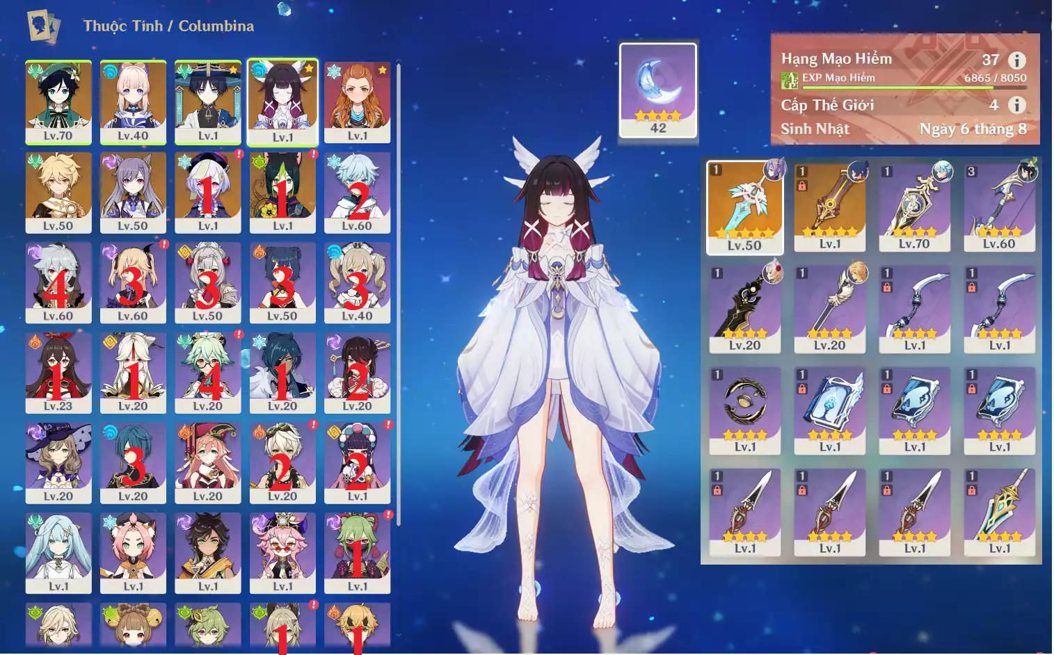 #358773 1,500,000đ 1,500,000đ AR level 24 Khu Vực asia Tướng 5* 7 Ar24: Nguyệt thần Columbina + Neuvillette + Zhongli + Kazuha + jeanC1 dehya bennetC2 main NAM ( banner vũ khí 5 trang ) Tướng : 7 Vũ khí : 0 Chi tiết