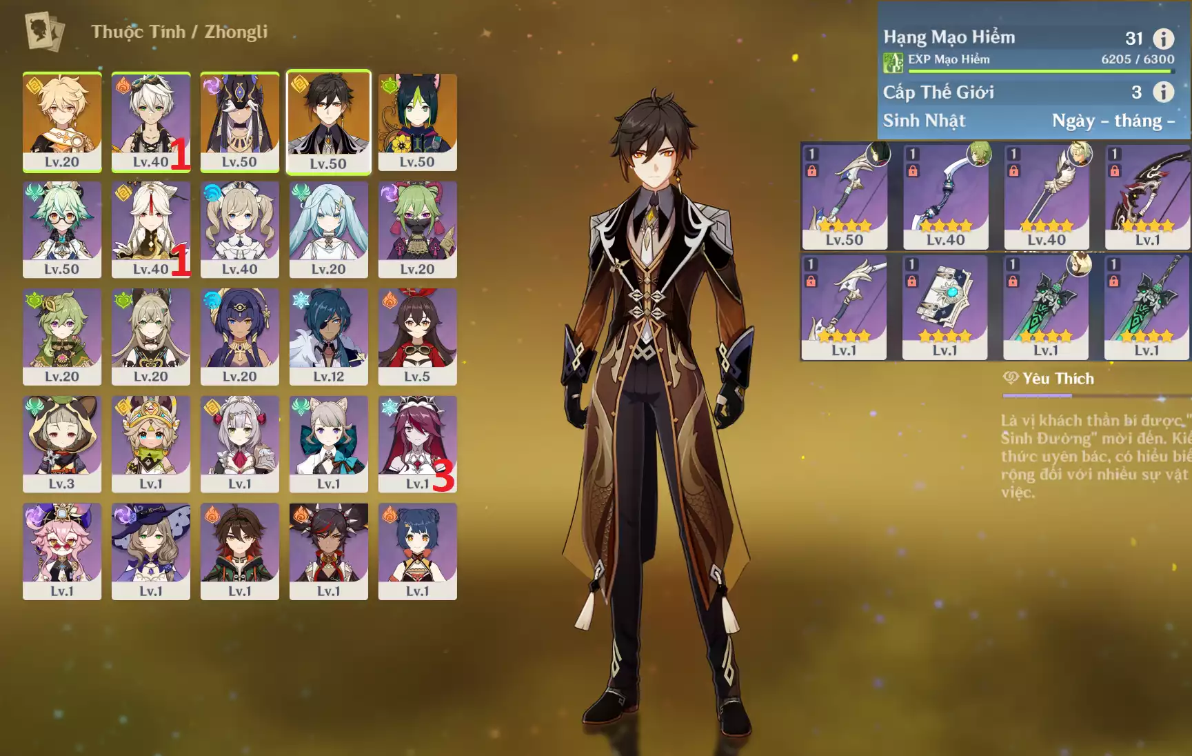 #358586 599,000đ 599,000đ AR level 31 Khu Vực asia Tướng 5* 3 Ar31 : Zhongli + Cyno + Tighnari _ banner nhân vật 55/90 ( chưa set user + sinh nhật ) _ map zin 99% Tướng : 3 Vũ khí : 0 Chi tiết