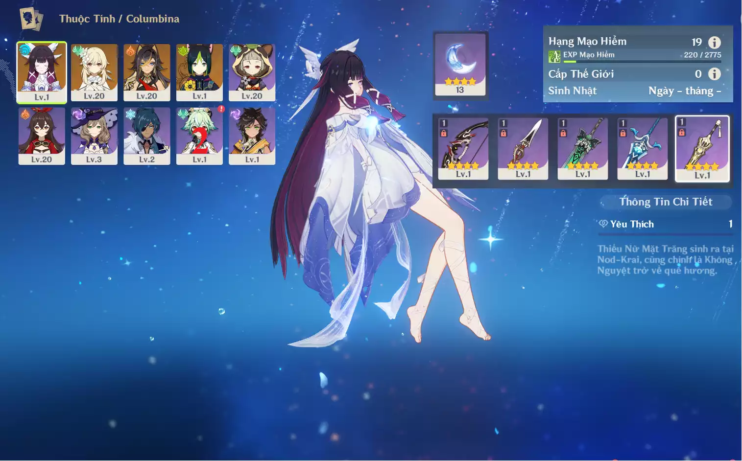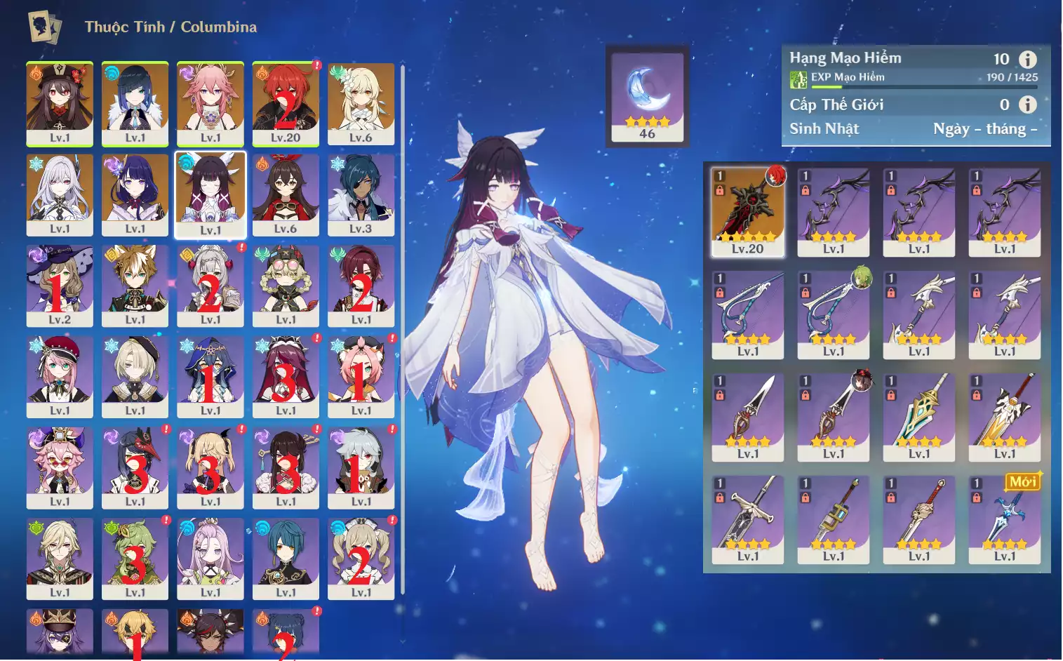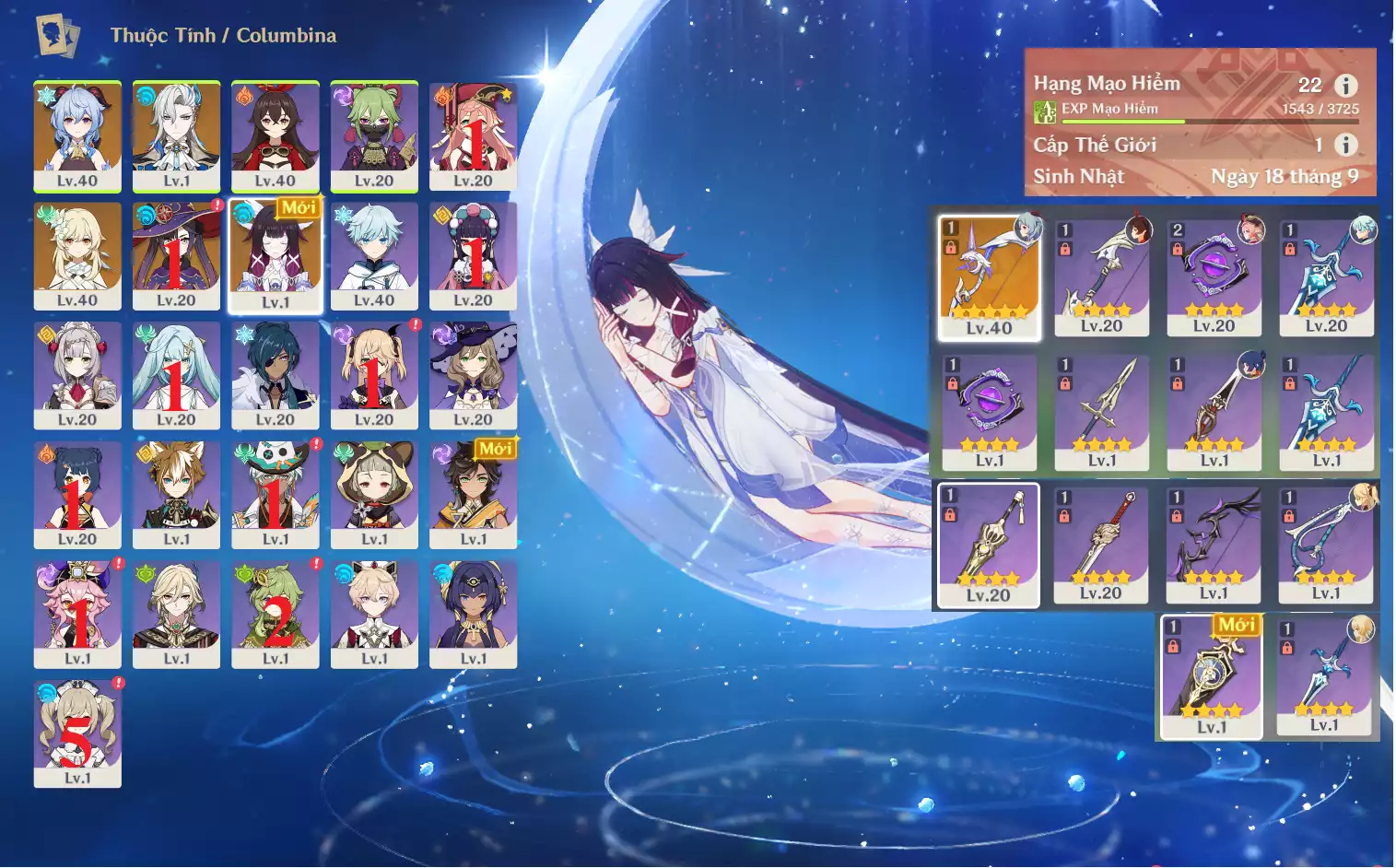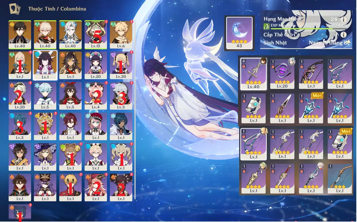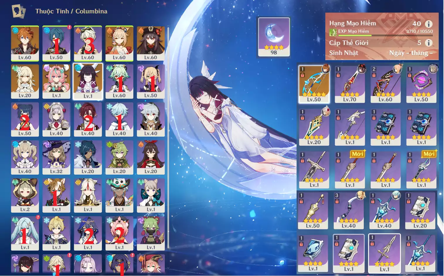 #358771 1,000,000đ 1,000,000đ AR level 40 Khu Vực asia Tướng 5* 6 AR40: Nguyệt thần Columbina + Varesa + HUTAO + CHIDLE TTDVT* + YOIMIYA + bennetC3 , banner vũ khí 6 trang , chưa set sinh nhật Tướng : 6 Vũ khí : 1 Chi tiết