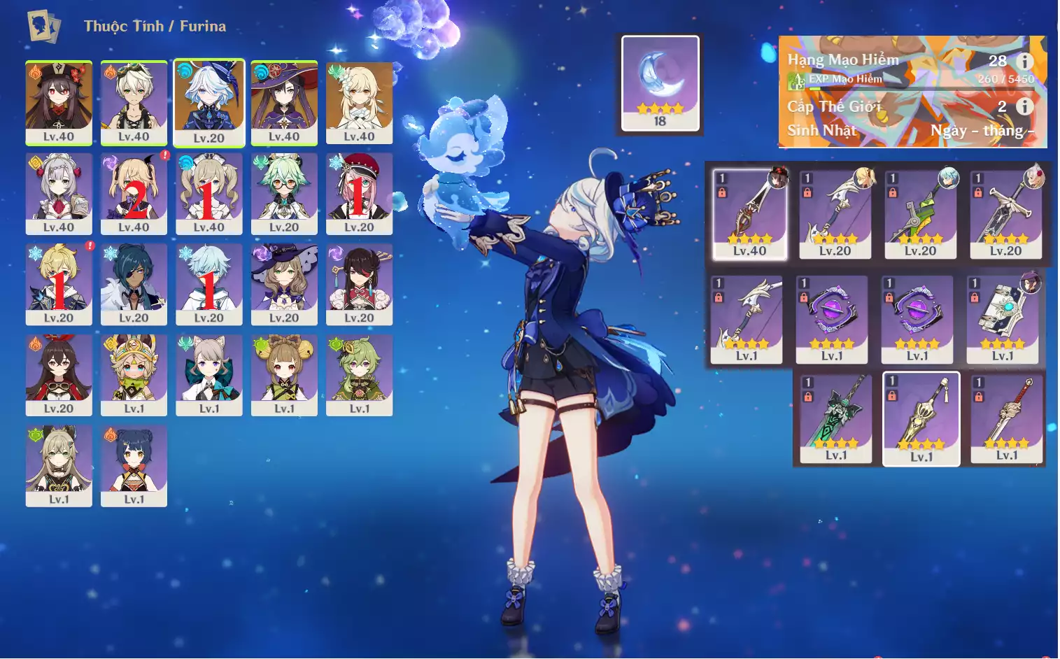 #358768 550,000đ 550,000đ AR level 28 Khu Vực asia Tướng 5* 3 Ar28: Furina + Hutao + Mona _ bennet, banner nhân vật 7 trang , chưa set sinh nhật , map zin 90% Tướng : 3 Vũ khí : 0 Chi tiết