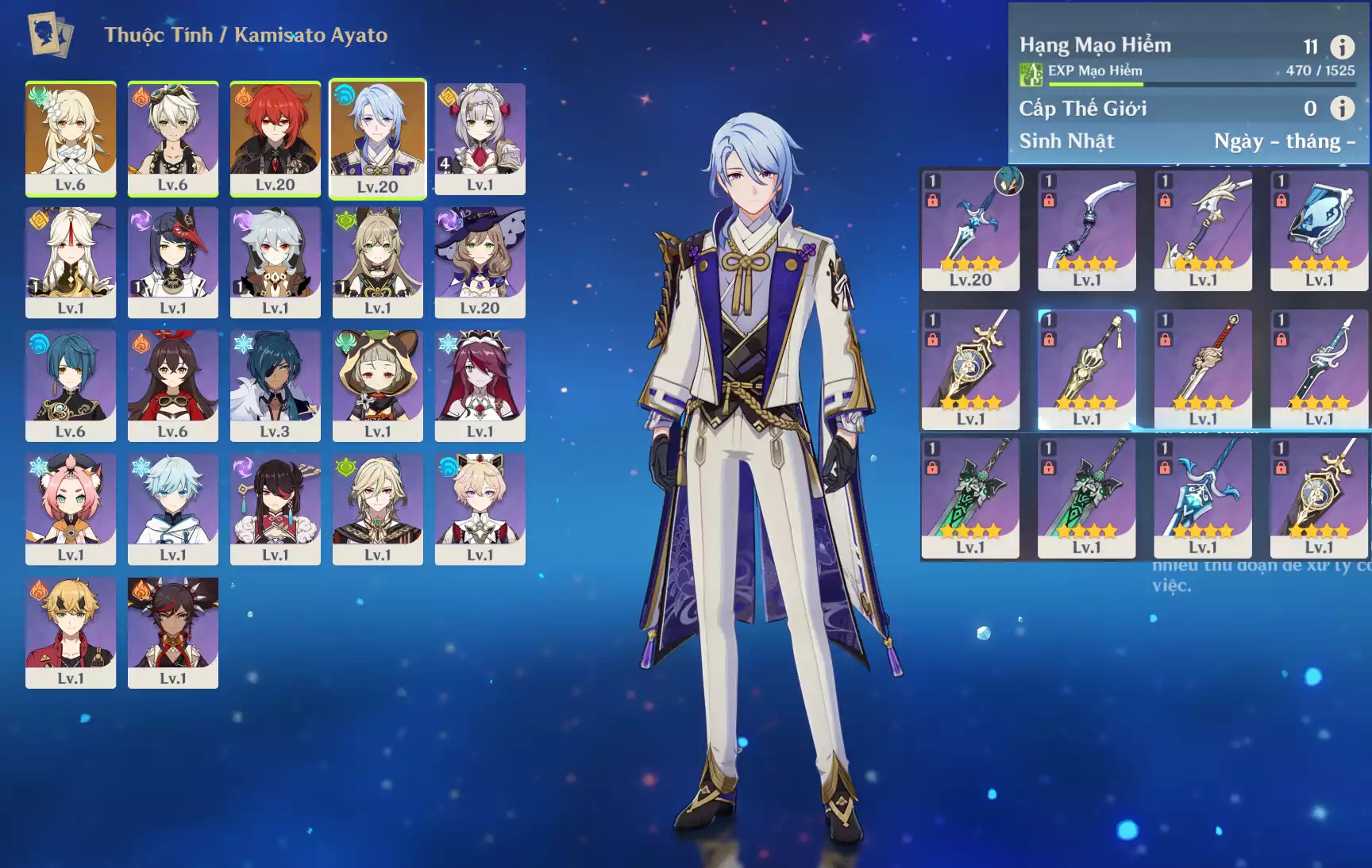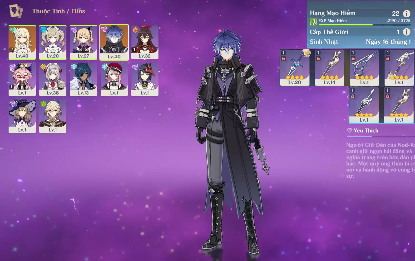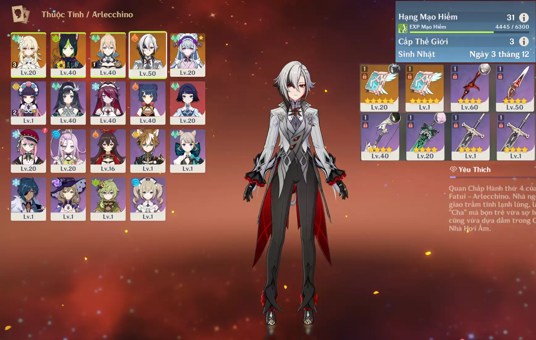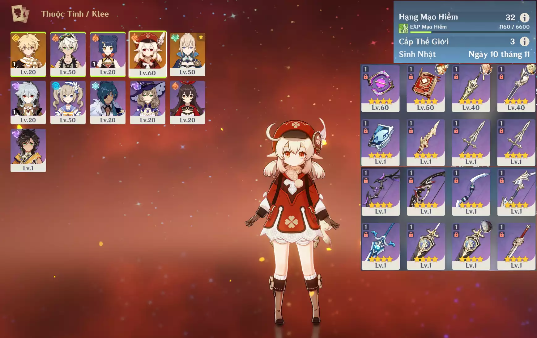 #361332 500,000đ 500,000đ AR level 25 Khu Vực asia Tướng 5* 3 Ar25: Klee + MonaC1 bennetC2 , banner nhân vật 15 trang + 11roll hồng sure nổ nhân vật , chưa set user _ chưa set sinh nhật Tướng : 3 Vũ khí : 0 Chi tiết