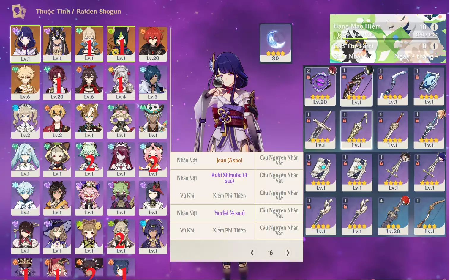 #361330 799,000đ 799,000đ AR level 10 Khu Vực asia Tướng 5* 5 VIP Ar10: Raiden Shogun BAAL + Cyno + TighnariC1 JeanC1 Diluc main NAM, banner nhân vật ĐÃ LỆCH 16 trang sure 1 char limited , chưa set mail_ chưa set sinh nhật Tướng : 5 Vũ khí : 0 Chi tiết