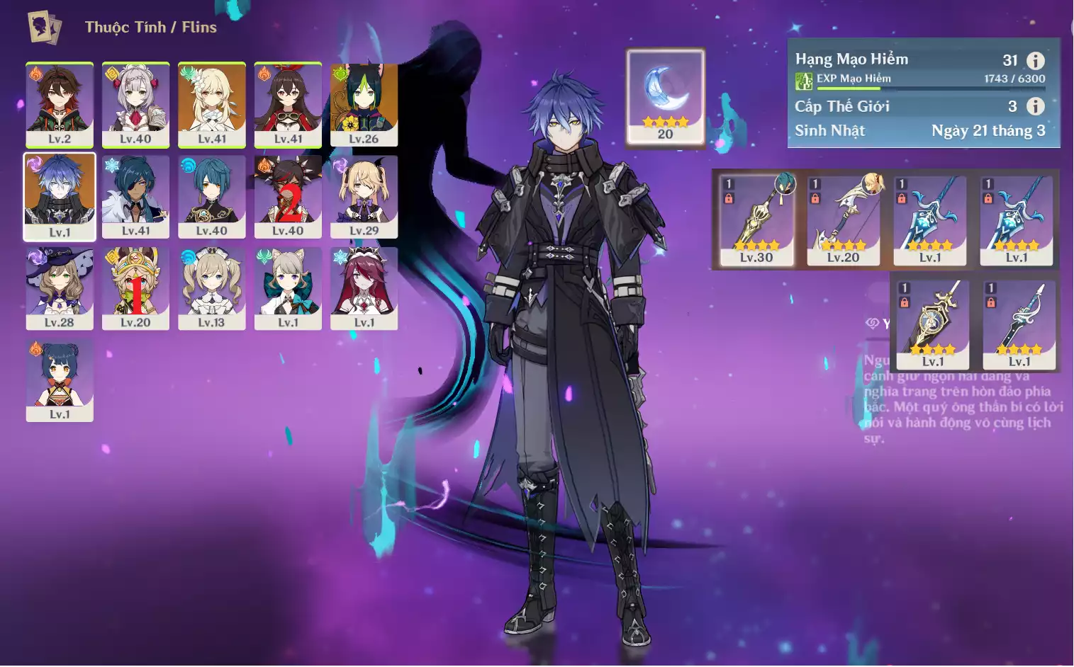 #361333 1,500,000đ 1,500,000đ AR level 32 Khu Vực asia Tướng 5* 8 VIP Ar32 combo: Flins + Ineffa + Columbina + Ganyu + Mizuki Diluc Keqing bennet + 4 roll hồng , chưa set user _ chưa set sinh nhật, map còn zin 99% Tướng : 8 Vũ khí : 0 Chi tiết