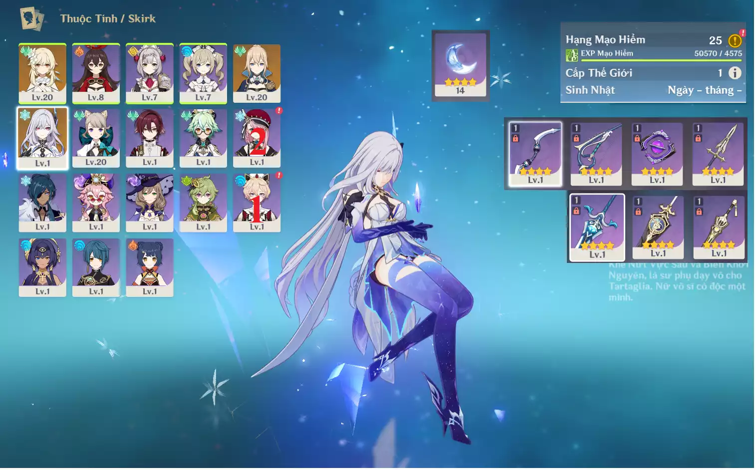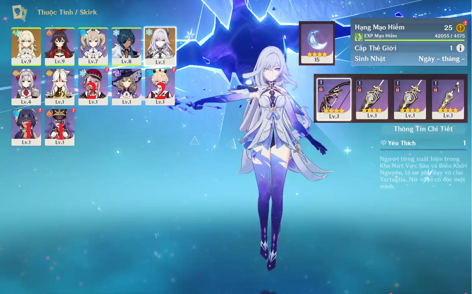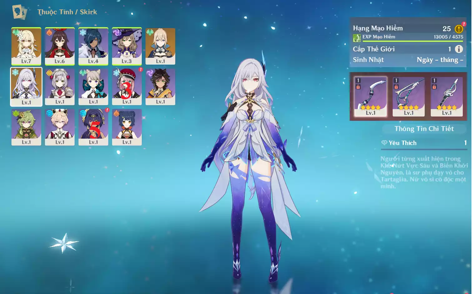 #361281 1,000,000đ 1,000,000đ AR level 11 Khu Vực asia Tướng 5* 3 VIP Ar11: Skirk trấn Thương diệu* + Tighnari bennet , chưa set user _ chưa set sinh nhật Tướng : 3 Vũ khí : 1 Chi tiết