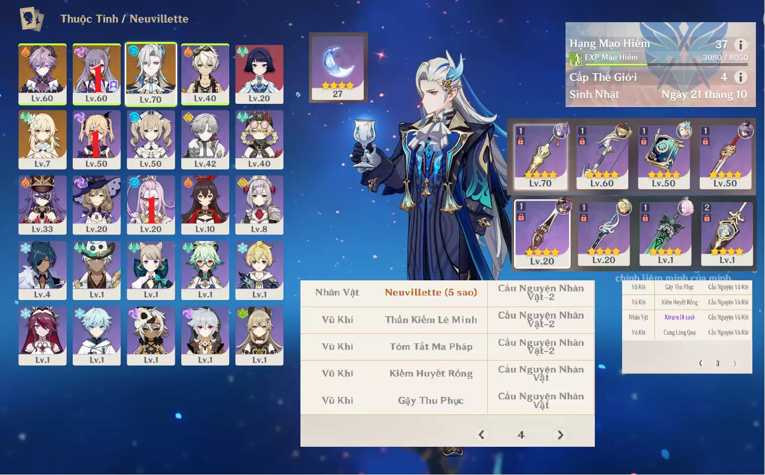 #361276 650,000đ 650,000đ AR level 37 Khu Vực asia Tướng 5* 4 Ar37: Neuvillette + Durin + KeqingCm1 bennet , banner nhân vật 4 trang , vũ khí 3 trang , chưa set user , map còn 95% Tướng : 4 Vũ khí : 0 Chi tiết