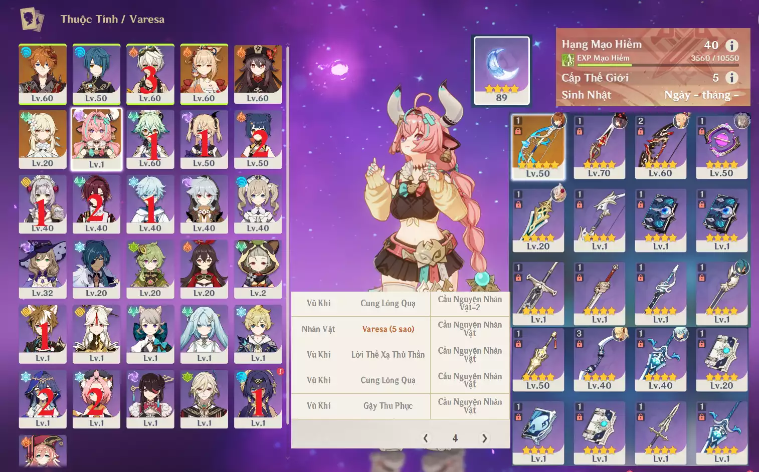#352362 450,000đ 450,000đ AR level 38 Khu Vực asia Tướng 5* 6 AR3x: NAHIDA + LYNEY + Mona Dehya + bennet_xingqiuC1 ( banner nhân vật ĐÃ LỆCH dehya 8 trang ) , chưa set sinh nhật , nguồn CN k lo back Tướng : 6 Vũ khí : 0 Chi tiết
