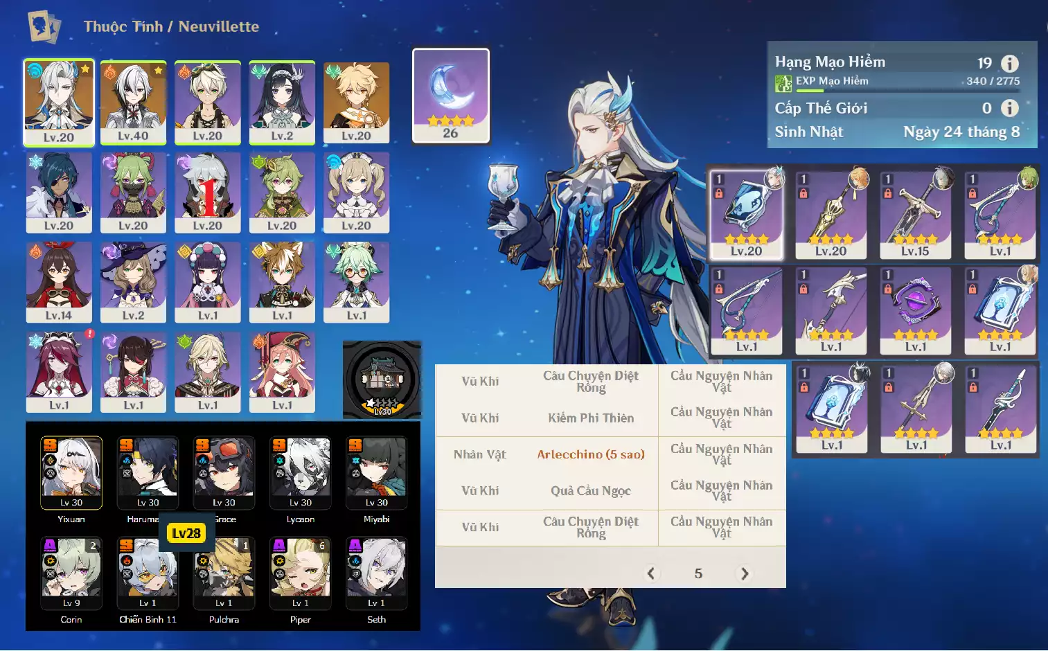 #352183 800,000đ 800,000đ AR level 19 Khu Vực asia Tướng 5* 3 VIP (mua 1 đc 2) ar19: Neuvillette + Arlecchino + bennet banner nhân vật 9 trang , + acc ZZZ khởi đầu vip ar28 Miyabi Trấn + Yixuan , chưa set user Tướng : 3 Vũ khí : 0 Chi tiết