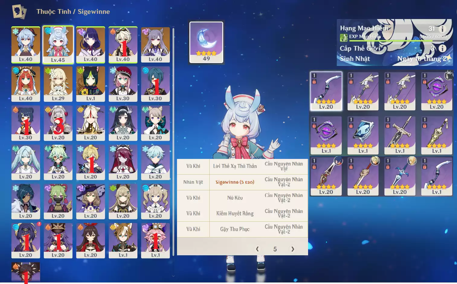 #352365 699,000đ 699,000đ AR level 31 Khu Vực asia Tướng 5* 8 SIÊU VIP Ar31: Sigewine + Raiden Shogun BAAL + GANYU + NILOU + Keqing Tighnari bennetC1_xingqiuC1 (banner nhân vật 12 trang ) , chưa set user Tướng : 8 Vũ khí : 0 Chi tiết