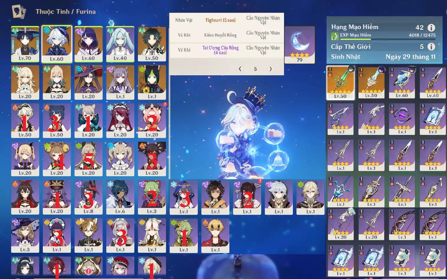 #352372 1,200,000đ 1,200,000đ AR level 39 Khu Vực asia Tướng 5* 9 Ar3x: Xiao Trấn HPD* + Raiden Shogun BAAL XSTK* + Furina + Scaramouche (kẻ lang thang) + Mona Jean Keqing Tighnari (banner nhân vật ĐÃ LỆCH 14 trang sure limited ) , chưa set mail Tướng : 9 Vũ khí : 2 Chi tiết