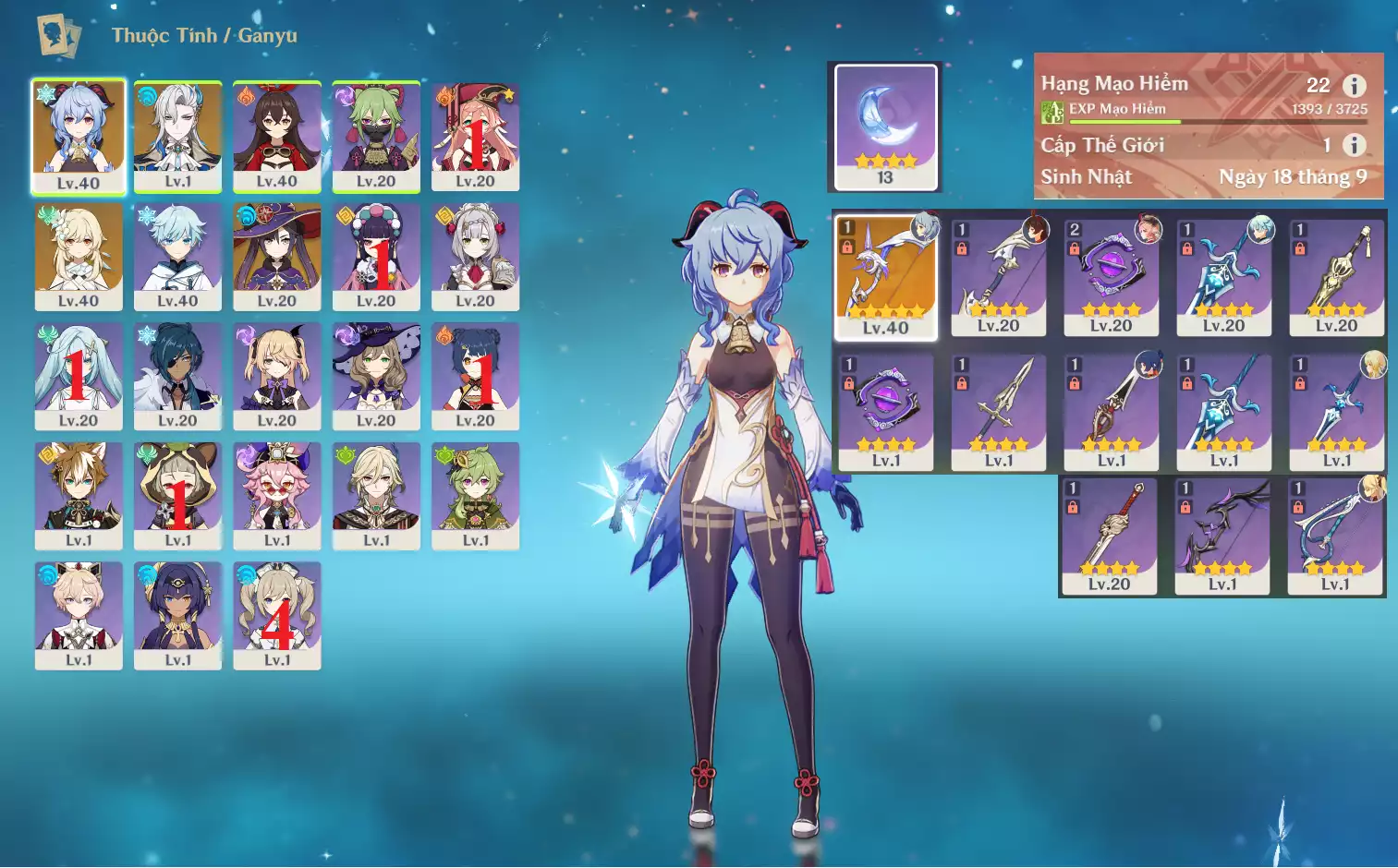 #352473 799,000đ 799,000đ AR level 22 Khu Vực asia Tướng 5* 3 VIP team đóng băng Ar22: Ganyu Trấn Amos* + Neuvillette + MonaCM1 ( banner nhân vật ĐÃ LỆCH 5 trang ) , chưa set user Tướng : 3 Vũ khí : 1 Chi tiết