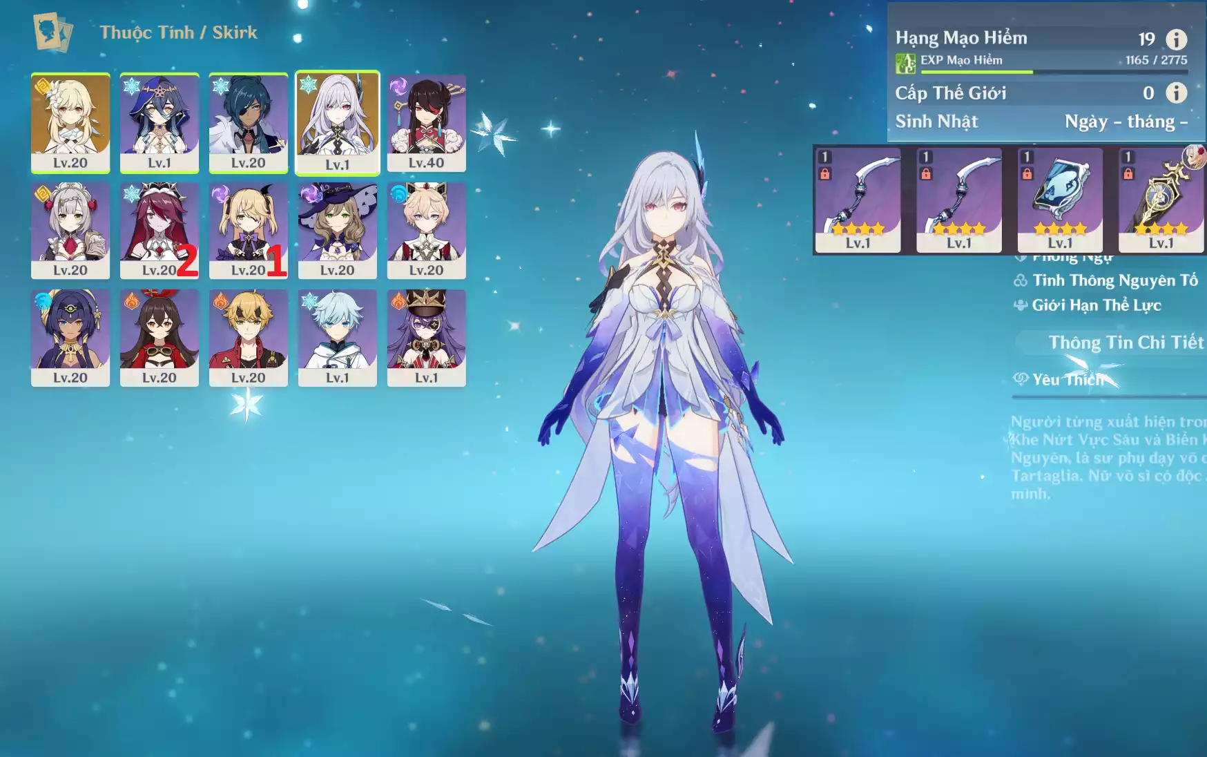 #352380 599,000đ 599,000đ AR level 35 Khu Vực asia Tướng 5* 5 Ar35 : Hutao + Cyno + Jean _ bennetC1 xingqiu _ banner nhân vật ĐÃ LỆCH 75/90 sure kèo 100% skirk ( chưa set user ) Tướng : 5 Vũ khí : 0 Chi tiết
