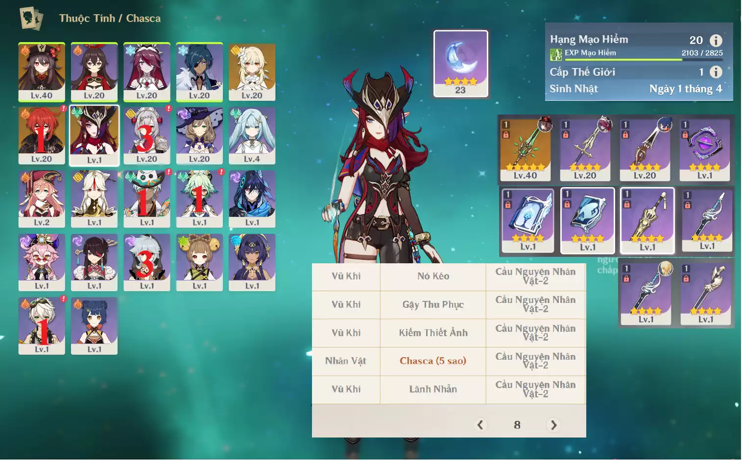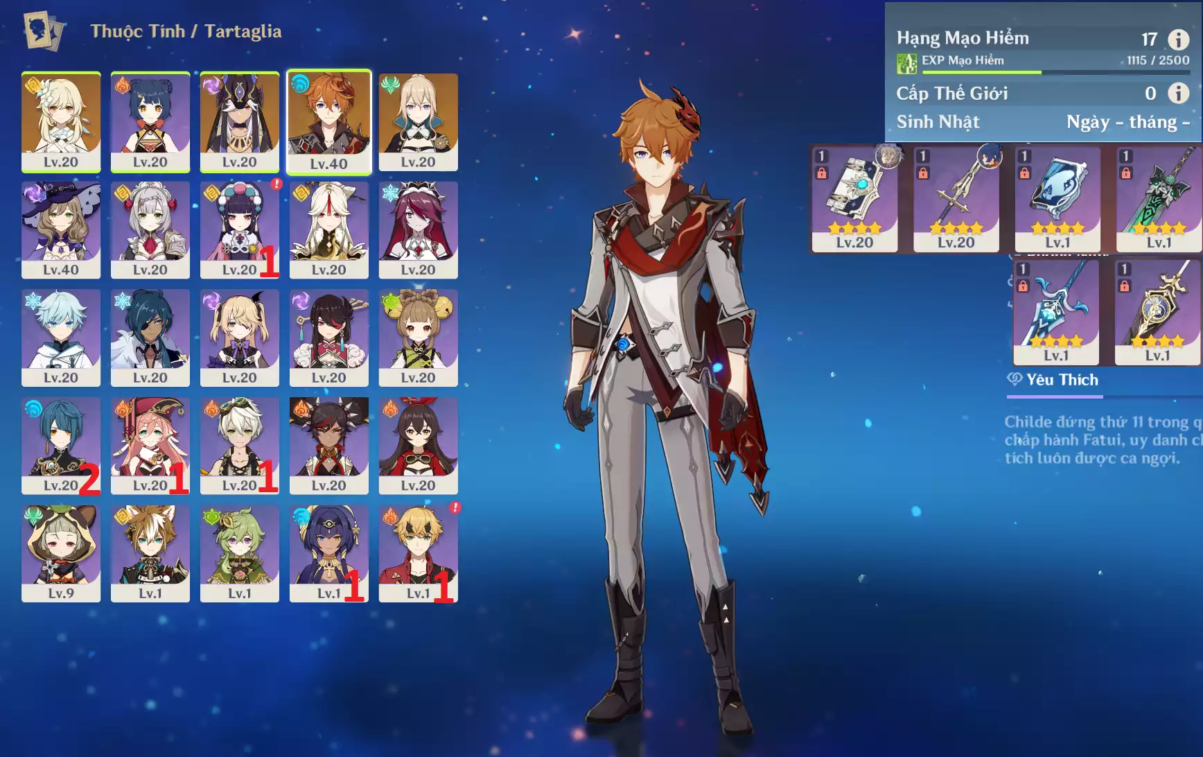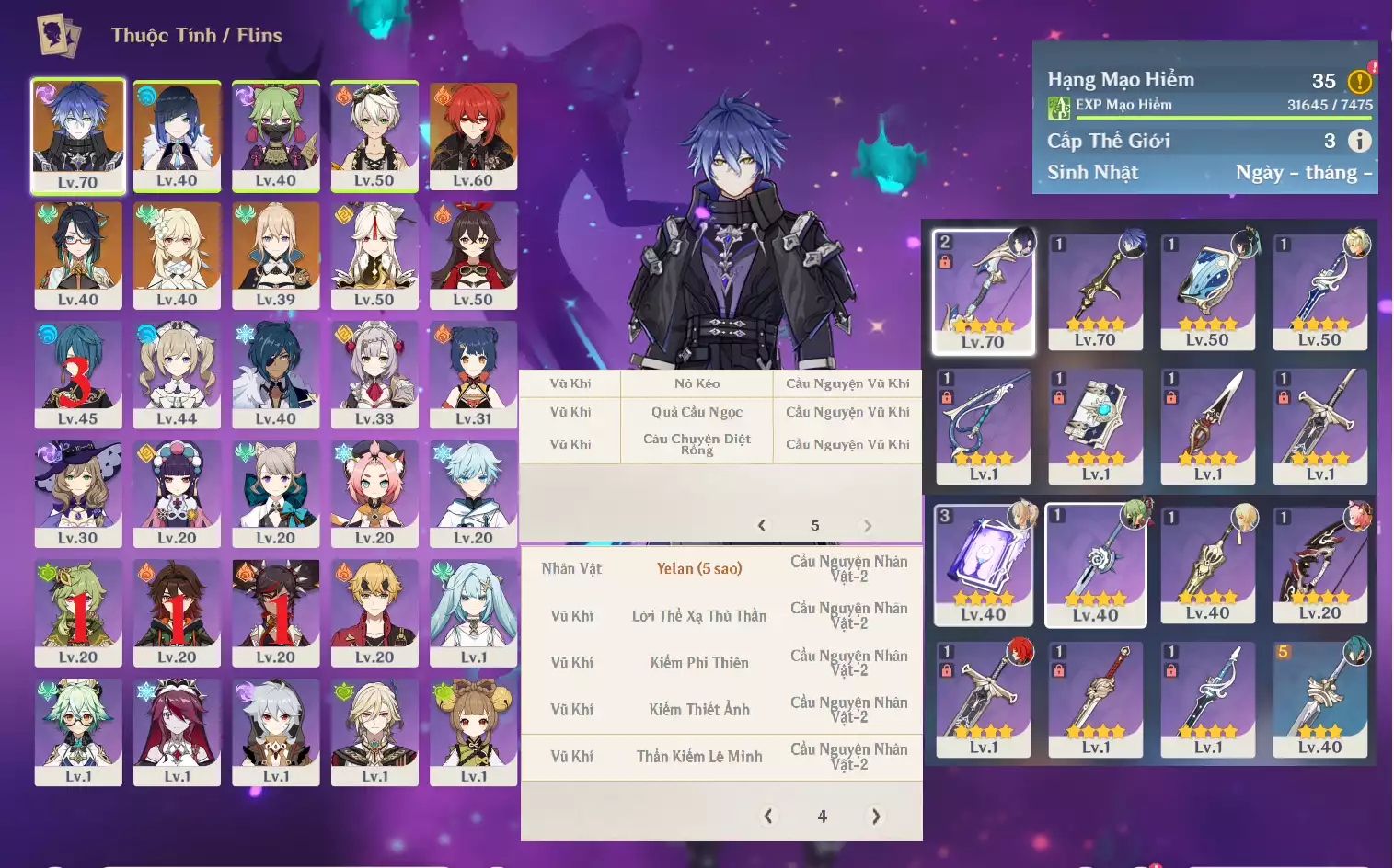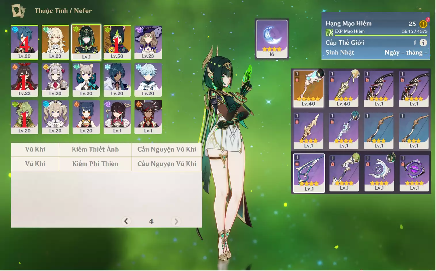 #357283 500,000đ 500,000đ AR level 17 Khu Vực asia Tướng 5* 3 Ar17 : Childe + Cyno + Jean _ banner nhân vật 40/90 ( chưa set user + sinh nhật ) Tướng : 3 Vũ khí : 0 Chi tiết