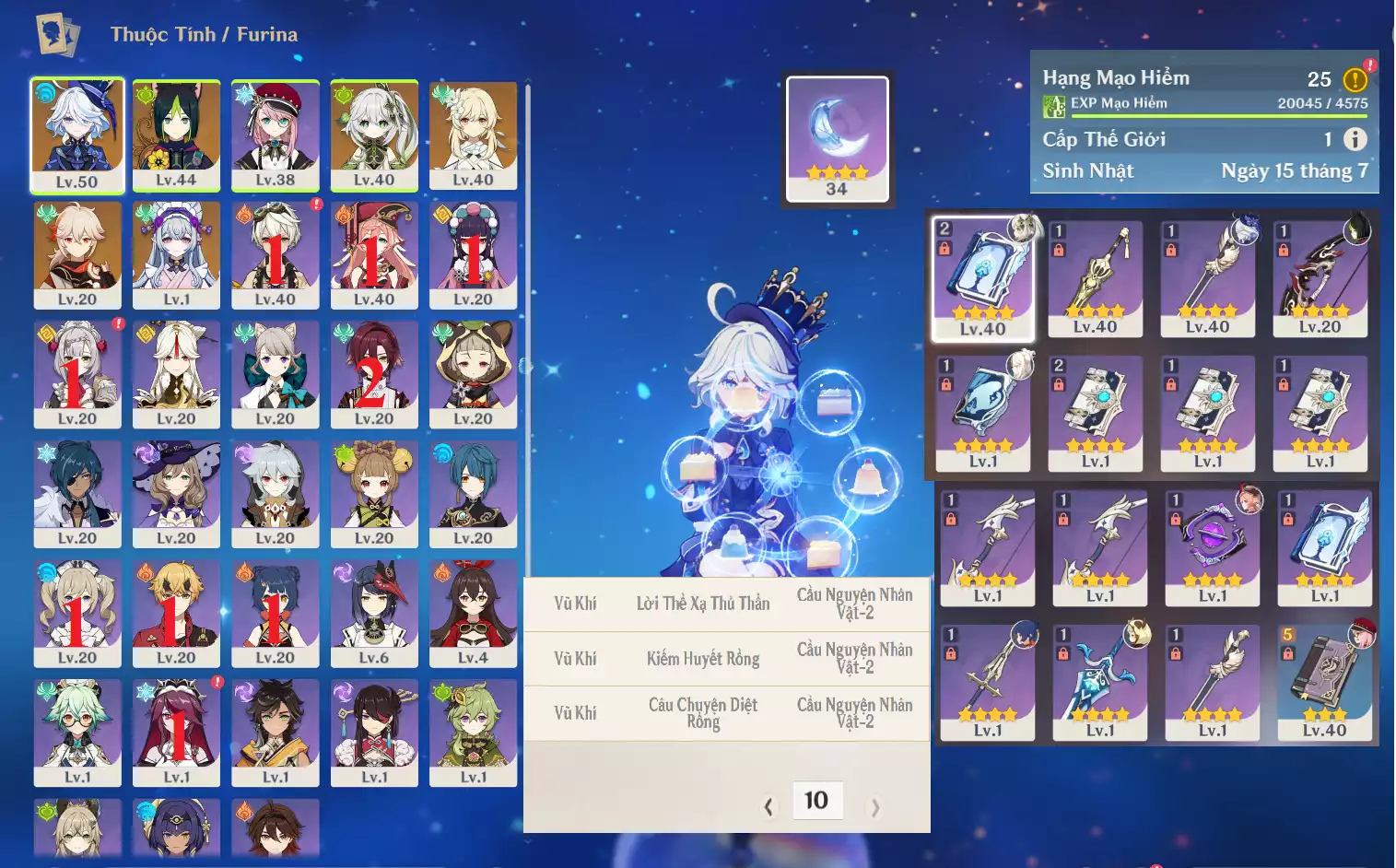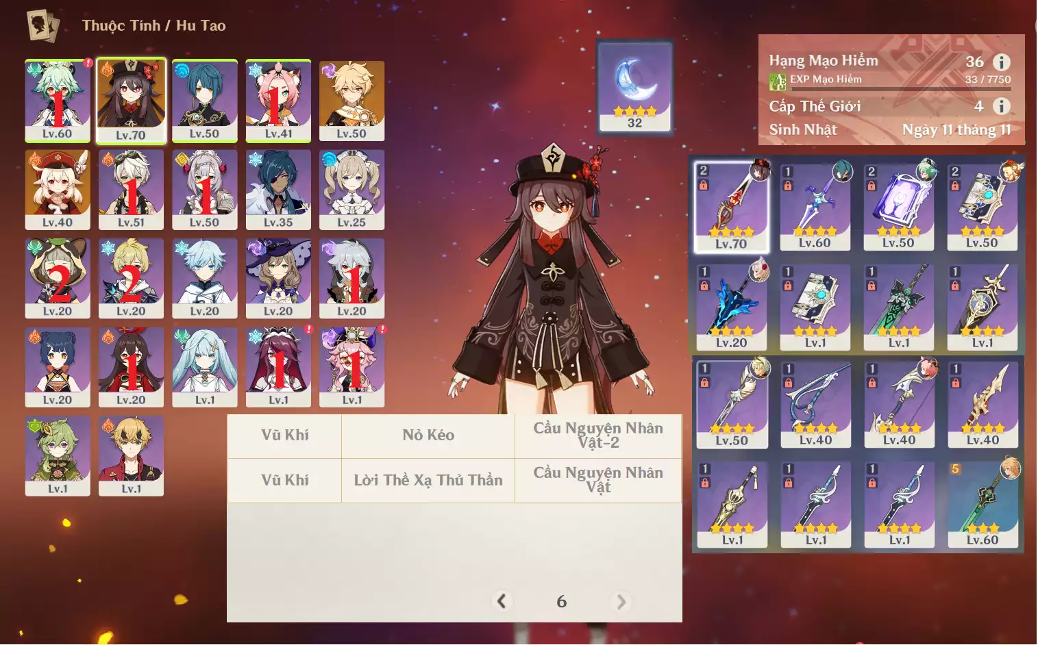 #357448 1,000,000đ 1,000,000đ AR level 21 Khu Vực asia Tướng 5* 8 Ar21 : Hutao + Furina + Raidenshogun-baal + Mualali + Tighnari + Mona _ banner nhân vật 1 trang ( chưa set sinh nhật , quên user ) Tướng : 8 Vũ khí : 0 Chi tiết