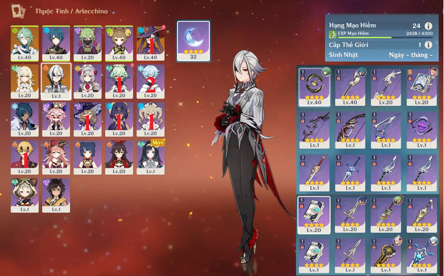 #357308 599,000đ 599,000đ AR level 24 Khu Vực asia Tướng 5* 3 Ar24: Arlecchino + Baizu + MonaC1 , chưa set mail _ chưa set sinh nhật , banner nhân vật 9 trang , map còn nguyên zin , nguồn CN k lo back Tướng : 3 Vũ khí : 0 Chi tiết