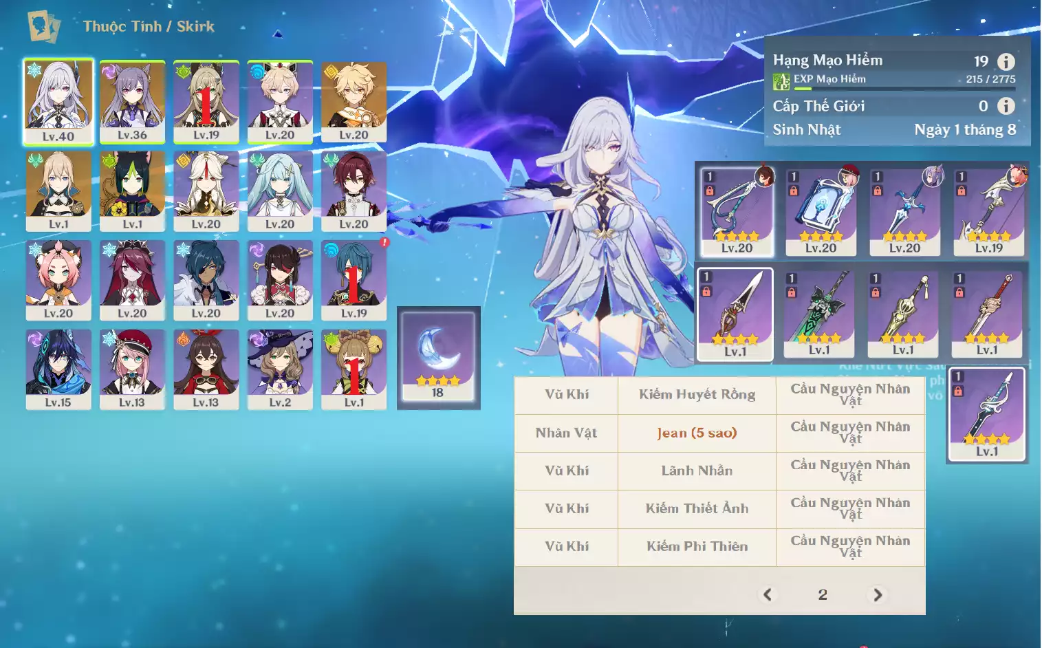#357425 599,000đ 599,000đ AR level 19 Khu Vực asia Tướng 5* 4 Ar19: Skirk + Jean Keqing Tighnari main NAM , banner nhân vật ĐÃ LỆCH 10 trang , chưa set user , map còn nguyên zin Tướng : 4 Vũ khí : 0 Chi tiết