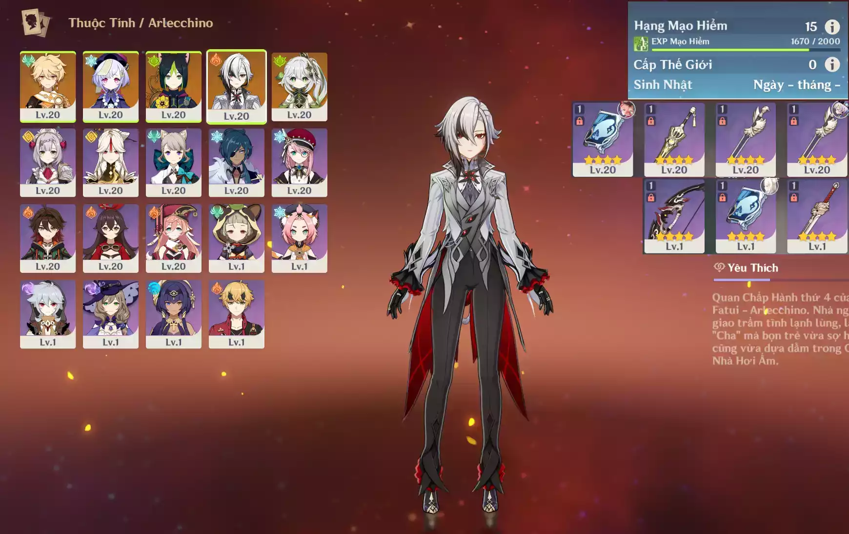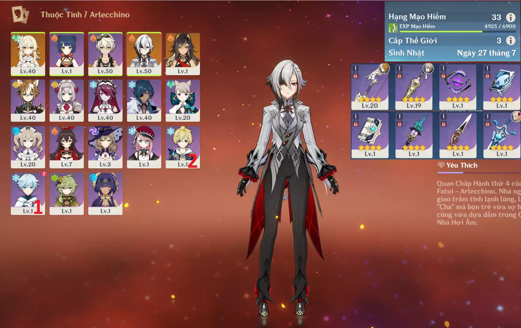 #349926 350,000đ 350,000đ AR level 33 Khu Vực asia Tướng 5* 4 Ar33 : Arlecchino + Dehya _ bennet xiangling _ banner nhân vật ĐÃ LỆCH 2 trang Tướng : 4 Vũ khí : 0 Chi tiết