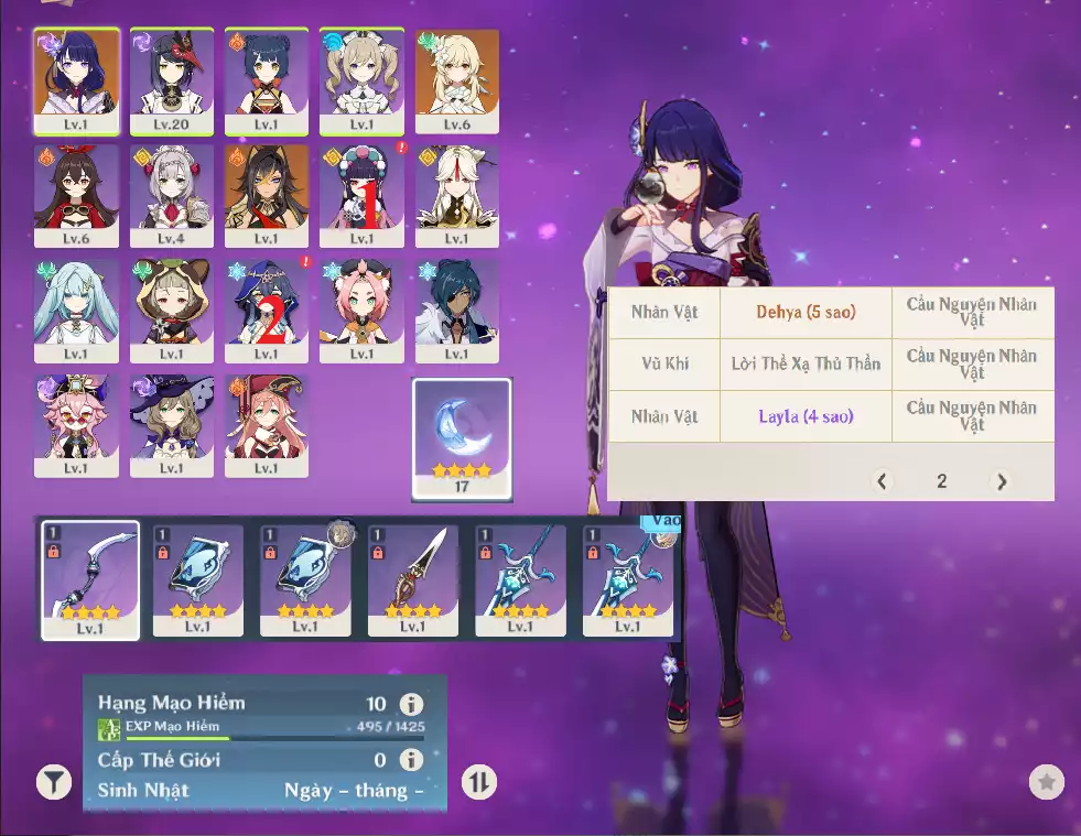 #350006 500,000đ 500,000đ AR level 10 Khu Vực asia Tướng 5* 2 Siêu hiếm Ar10: Raiden Shogun BAAL + DEHYA ( banner nhân vật ĐÃ LỆCH 10/90 ) , chưa set user _ chưa set sinh nhật Tướng : 2 Vũ khí : 0 Chi tiết