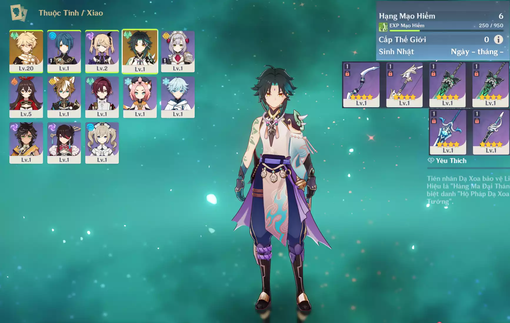 #361015 399,000đ 399,000đ AR level 6 Khu Vực asia Tướng 5* 1 acc khởi đầu Ar6 : Xiao _ banner nhân vật 30/90 lần ( acc trắng thông tin _ chưa set email + sinh nhật ) Tướng : 1 Vũ khí : 0 Chi tiết