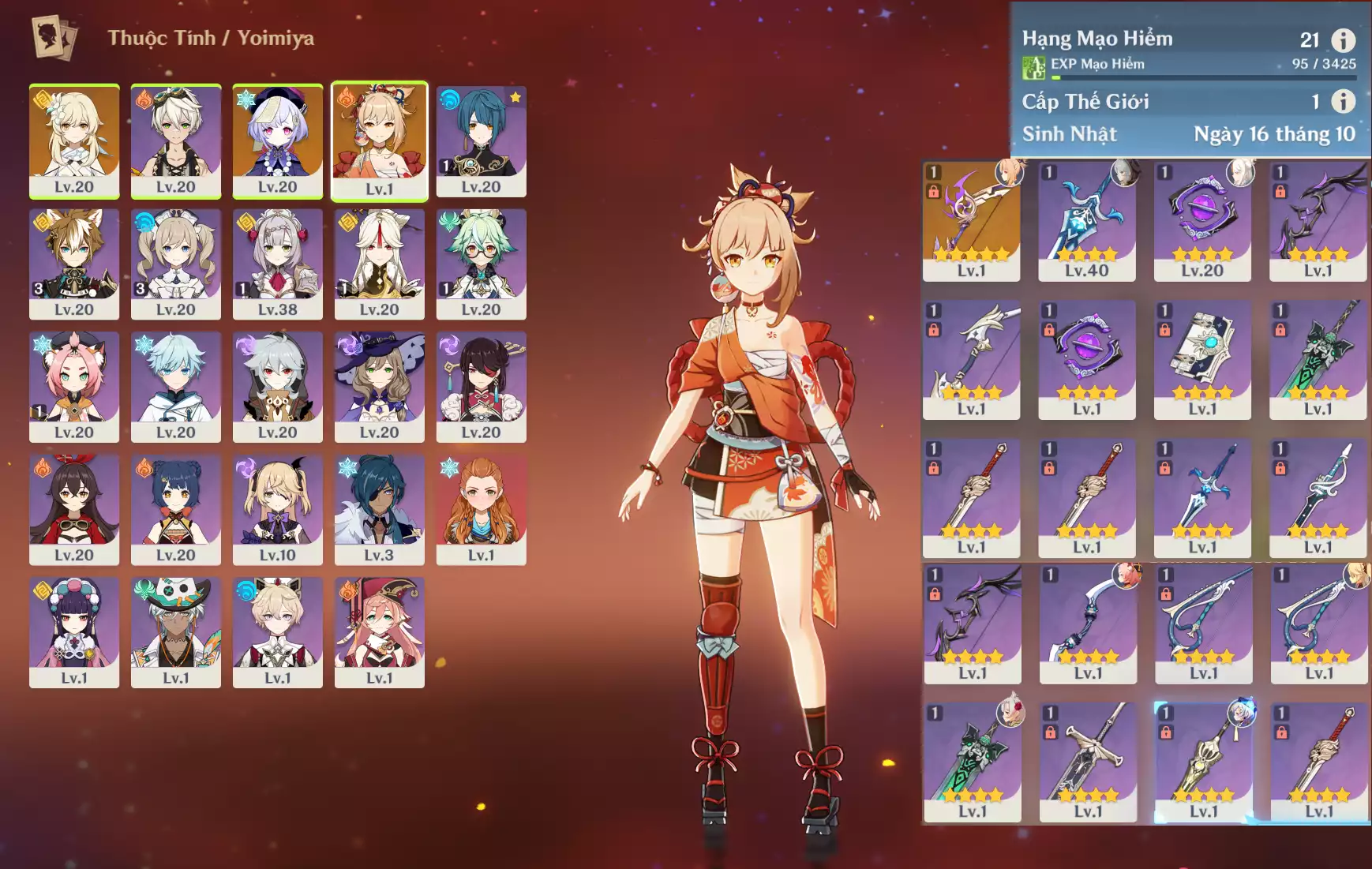#361018 499,000đ 499,000đ AR level 21 Khu Vực asia Tướng 5* 4 Ar21 : Yoimiya + Trấn ( SSRĐ ) + QiQi _ bennet xingqiuC1 _ banner nhân vật 20/90 ( chưa set email ) _ map zin gần 100% Tướng : 4 Vũ khí : 1 Chi tiết