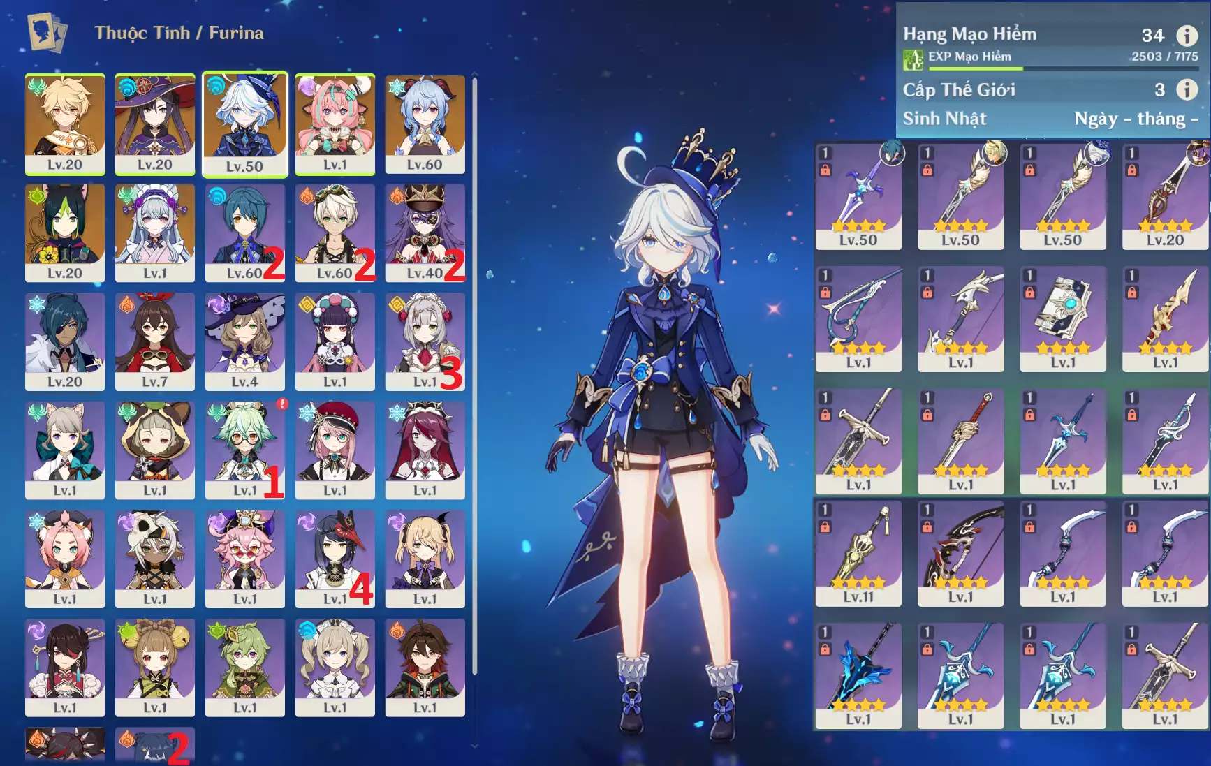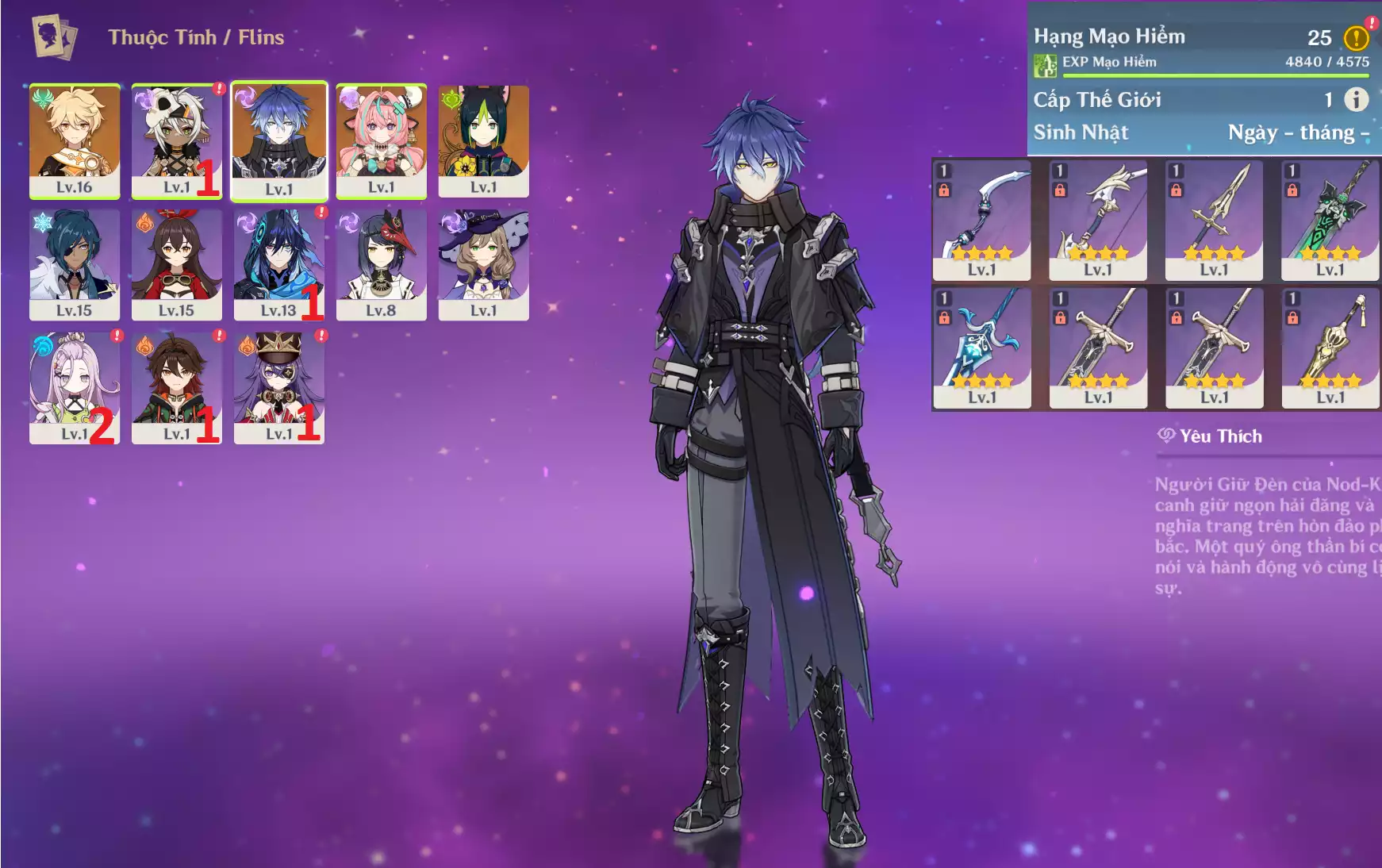 #356526 699,000đ 699,000đ AR level 25 Khu Vực asia Tướng 5* 2 Ar25 : Flins + Varesa + Tighnari _ banner nhân vật 20/90 ( chưa set user + sinh nhật ) Tướng : 2 Vũ khí : 0 Chi tiết