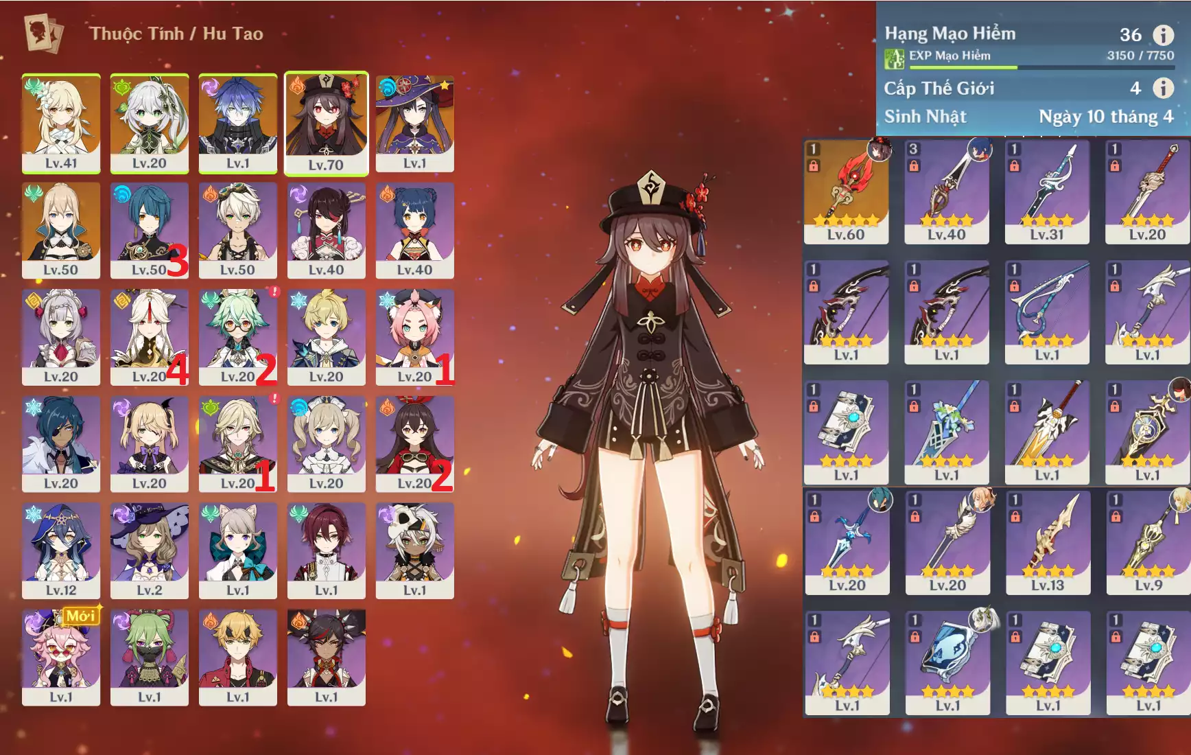 #356522 999,000đ 999,000đ AR level 36 Khu Vực asia Tướng 5* 4 Ar36 : Hutao + Trấn ( Homa ) + Flins + Nahida + Mona + Jean _ banner nhân vật 1 trang _ map zin 99% Tướng : 4 Vũ khí : 1 Chi tiết