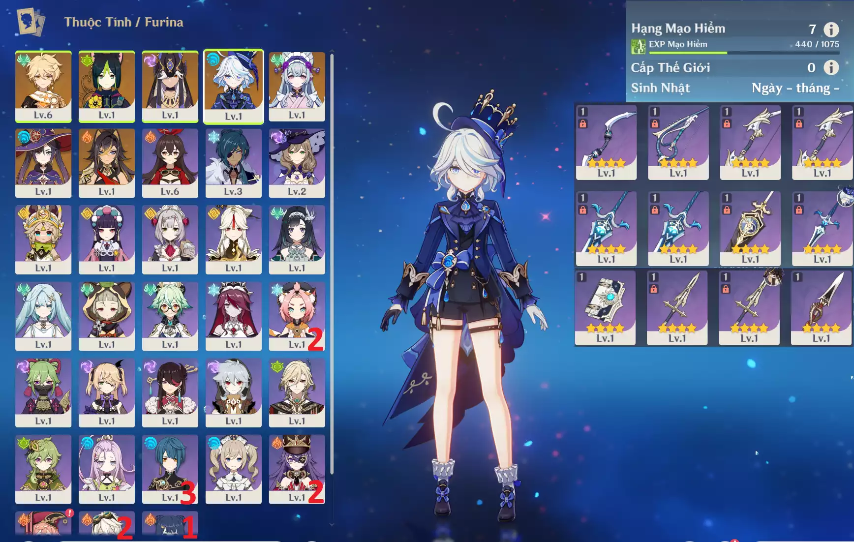 #356523 800,000đ 800,000đ AR level 7 Khu Vực asia Tướng 5* 8 Ar7 : Furina + Cyno + Dehya + Tighnari + Mizuki + Mona _ banner nhân vật ĐÃ LỆCH 70/90 - sure kèo 1 char limted ( acc trắng thông tin _ chưa set email + sinh nhật ) Tướng : 8 Vũ khí : 0 Chi tiết