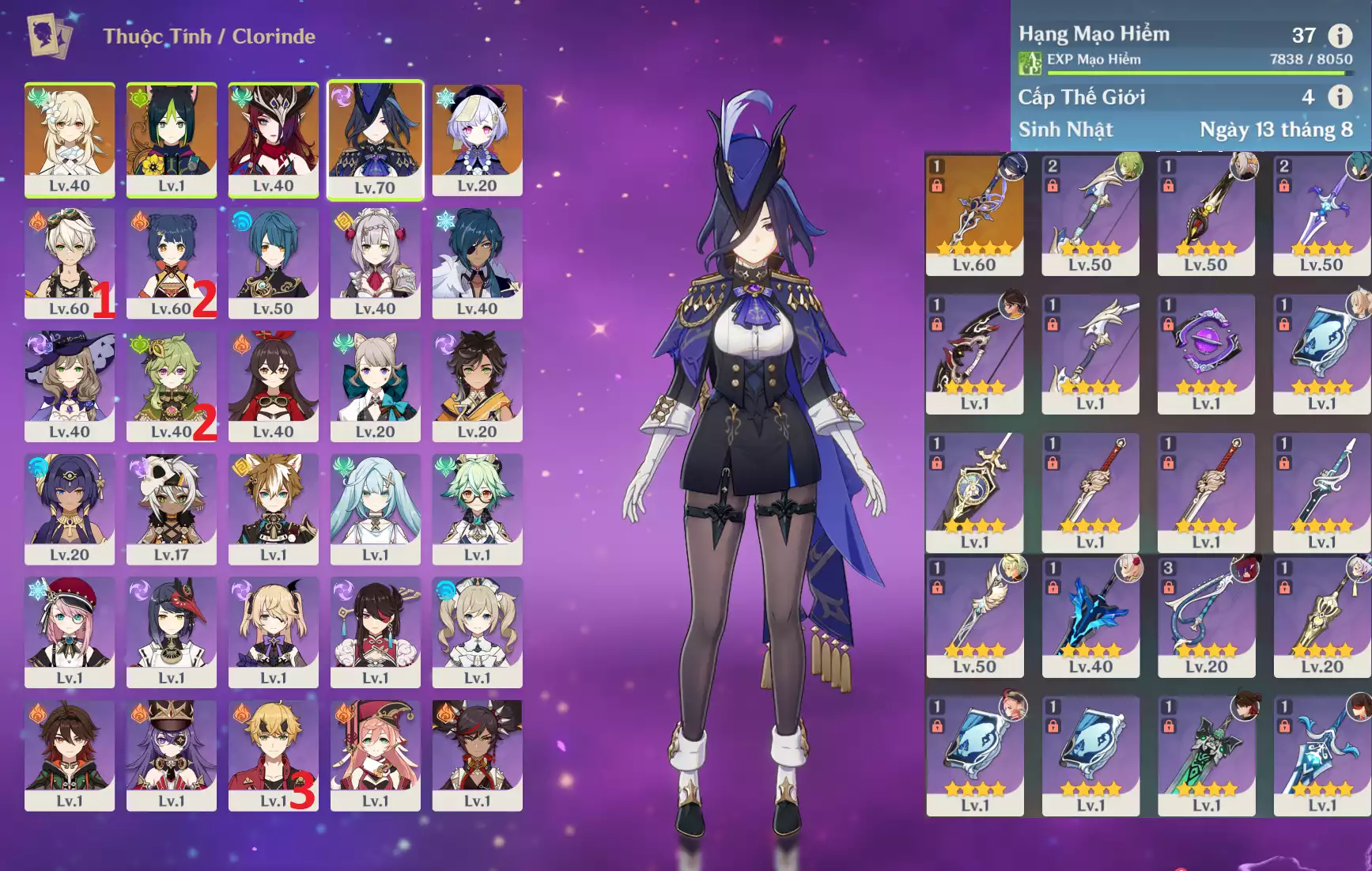 #356530 800,000đ 800,000đ AR level 37 Khu Vực asia Tướng 5* 5 Ar37: Clorinde * Trấn ( Xá tội ) + Chasca + Tighnari + QiQi _ bennetC1 xingqiu _ banner nhân vật 70/90 + 16 roll hồng - sure nổ banner limted Tướng : 5 Vũ khí : 1 Chi tiết