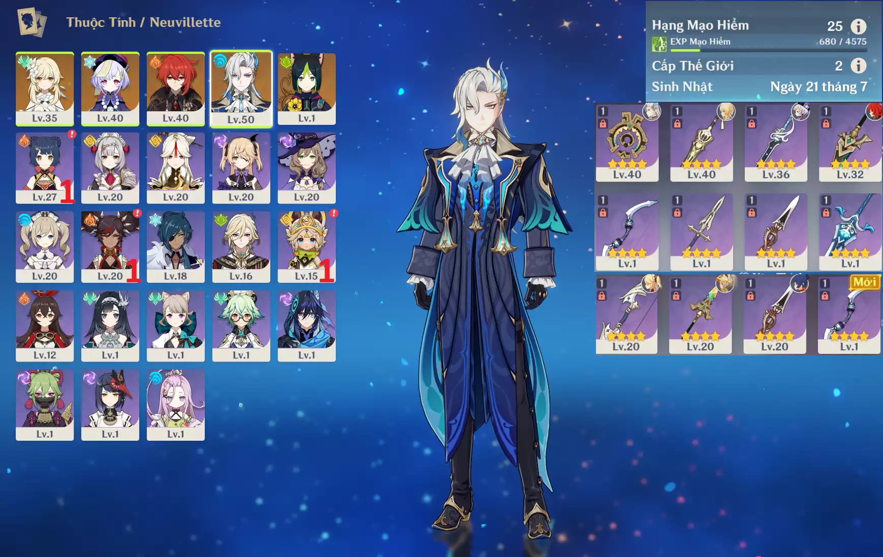#356531 699,000đ 699,000đ AR level 26 Khu Vực asia Tướng 5* 2 Ar26 : Neuvillette + Flins + QiQiC1 _ banner nhân vật 1 trang _ map zin 99% Tướng : 2 Vũ khí : 0 Chi tiết