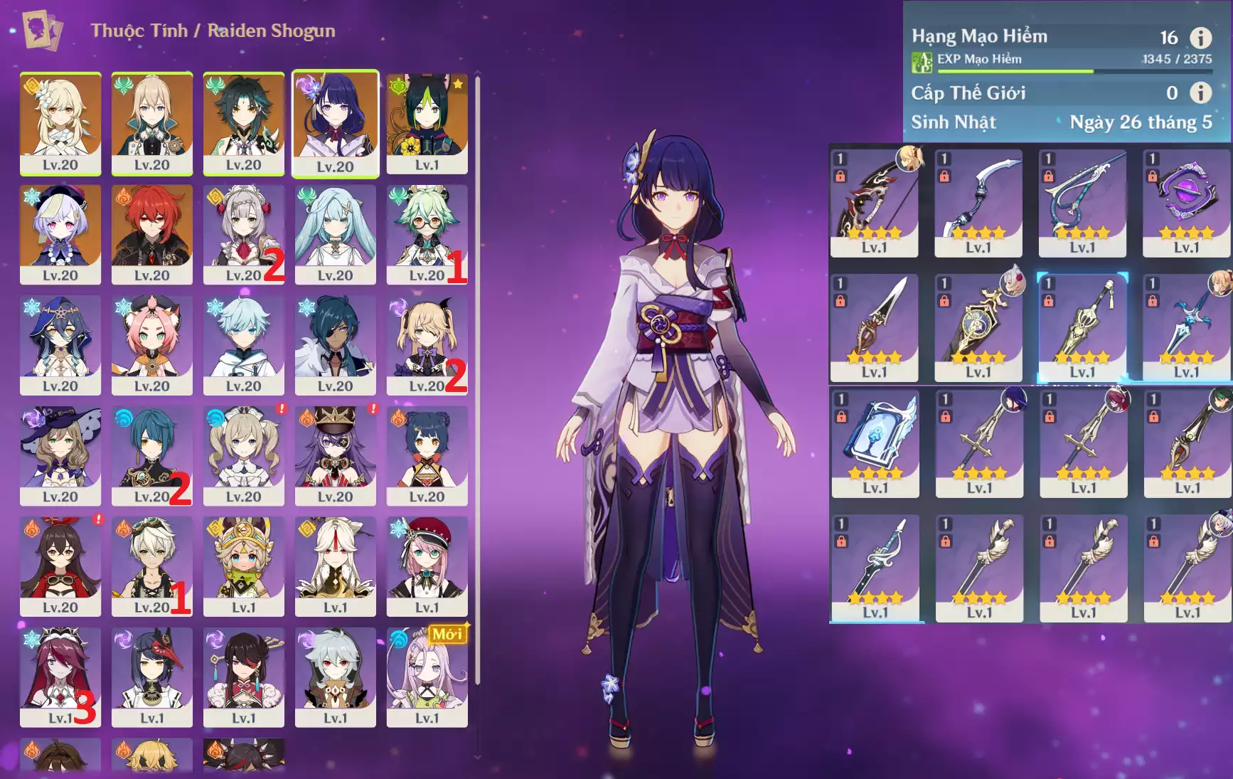#356533 699,000đ 699,000đ AR level 16 Khu Vực asia Tướng 5* 2 Ar16 : Raidenshogun-baal + Xiao + Jean + Tighnari + Diluc + QiQi _ bennetC1 xingqiuC2 _ banner nhân vật 70/90 lần. Tướng : 2 Vũ khí : 0 Chi tiết