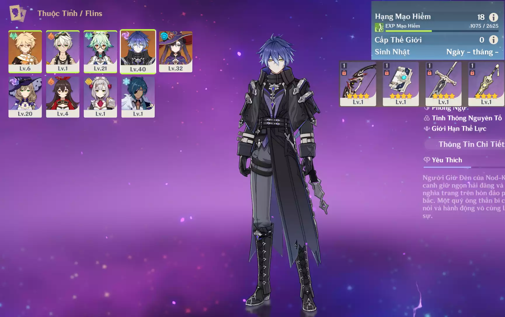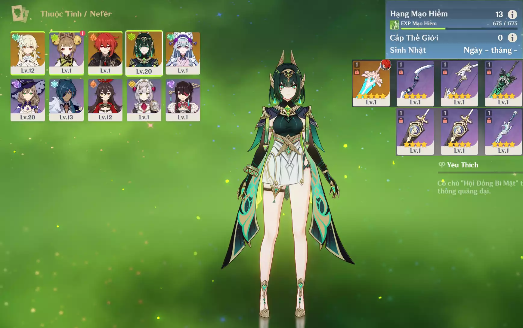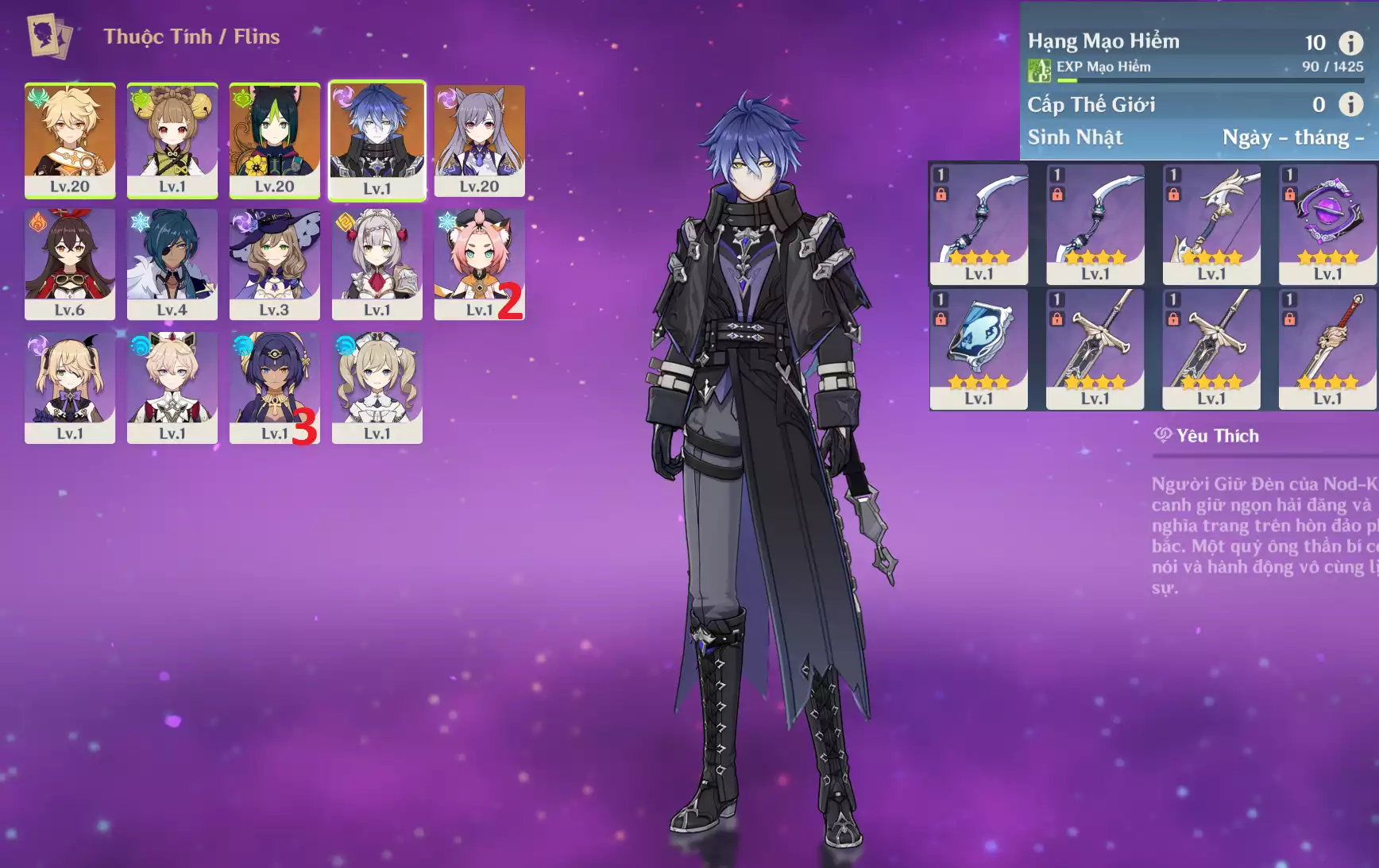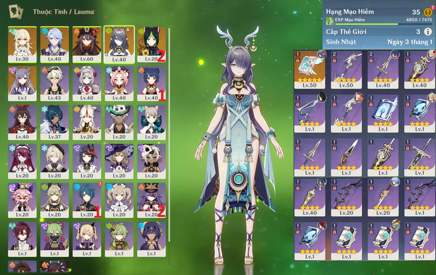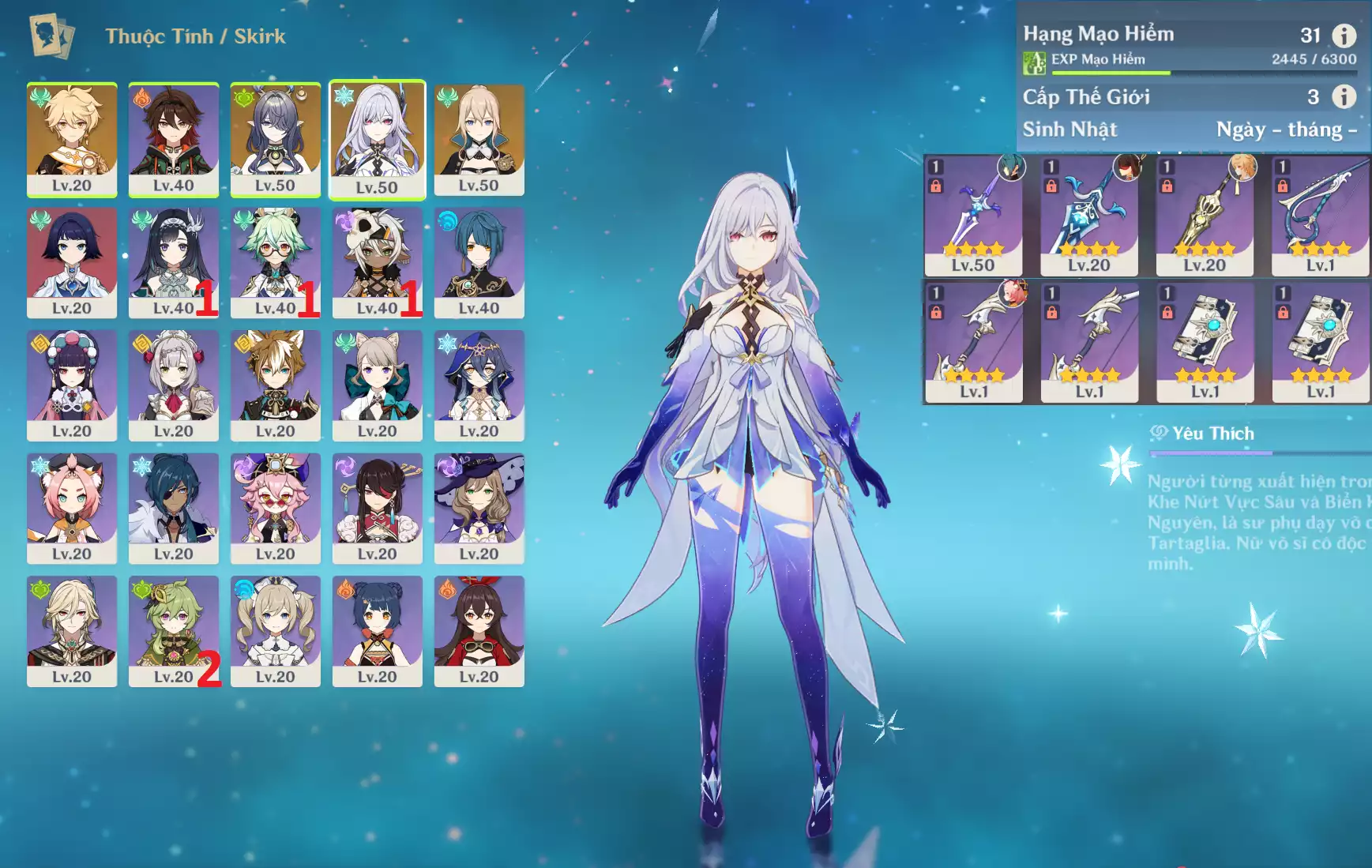 #356811 799,000đ 799,000đ AR level 35 Khu Vực asia Tướng 5* 5 Ar35 : Lauma + Hutao + Ayato + TighnariC2+ Keqing + QTK _ banner nhân vật ĐÃ LỆCH 15/90 lần ( chưa set user ) _ map zin 99% Tướng : 5 Vũ khí : 1 Chi tiết