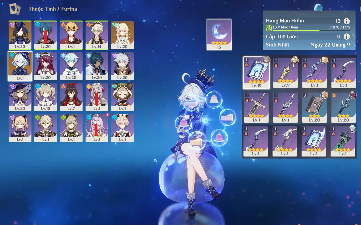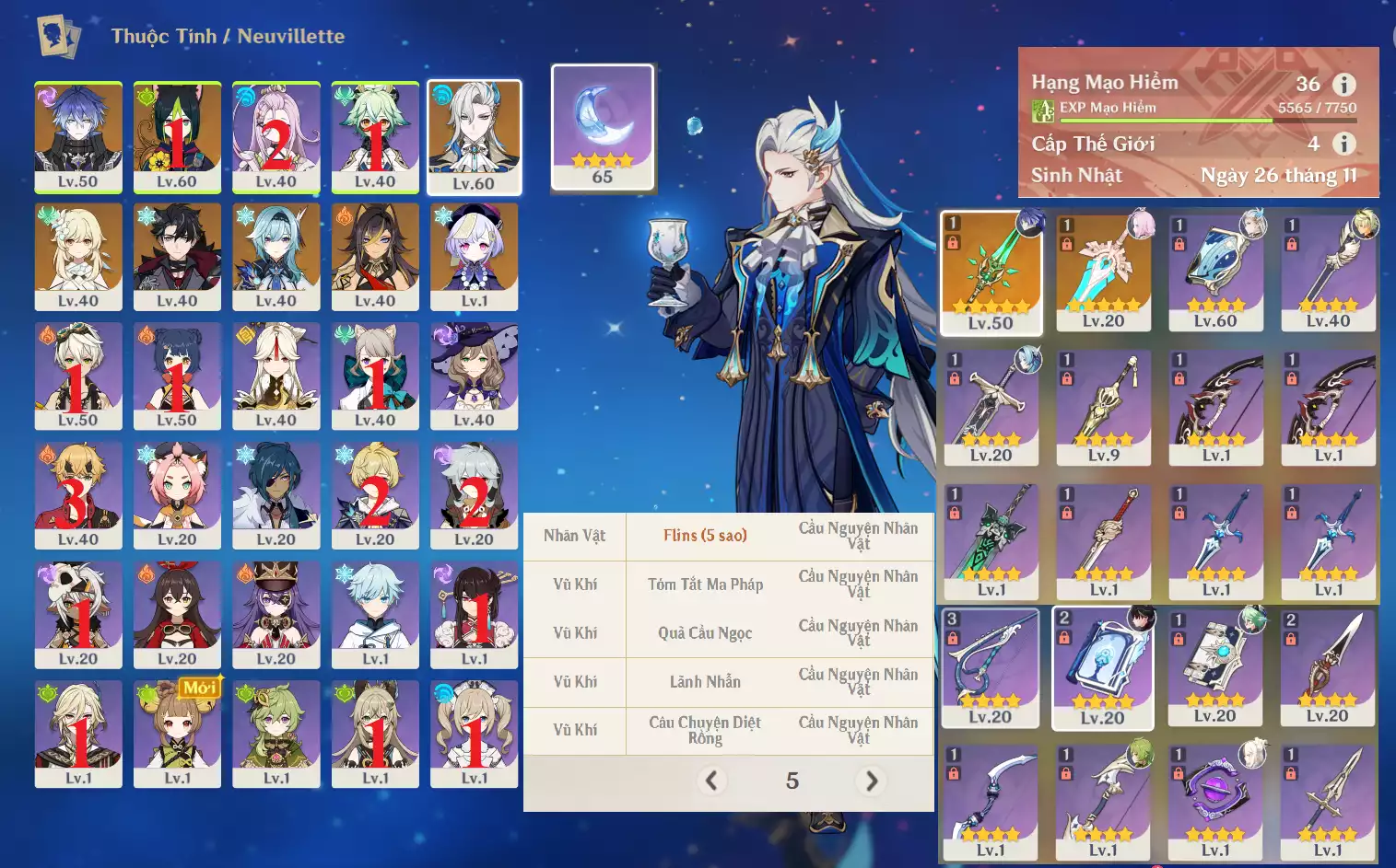 #357106 1,000,000đ 1,000,000đ AR level 36 Khu Vực asia Tướng 5* 8 Ar36: Flins HPD* + Neuvillette + Wriot + Eula TKKN* + TighnariCm1 Dehya QiQi bennetC1 +10 roll hồng event , banner nhân vật 8 trang , map còn 90% Tướng : 8 Vũ khí : 2 Chi tiết