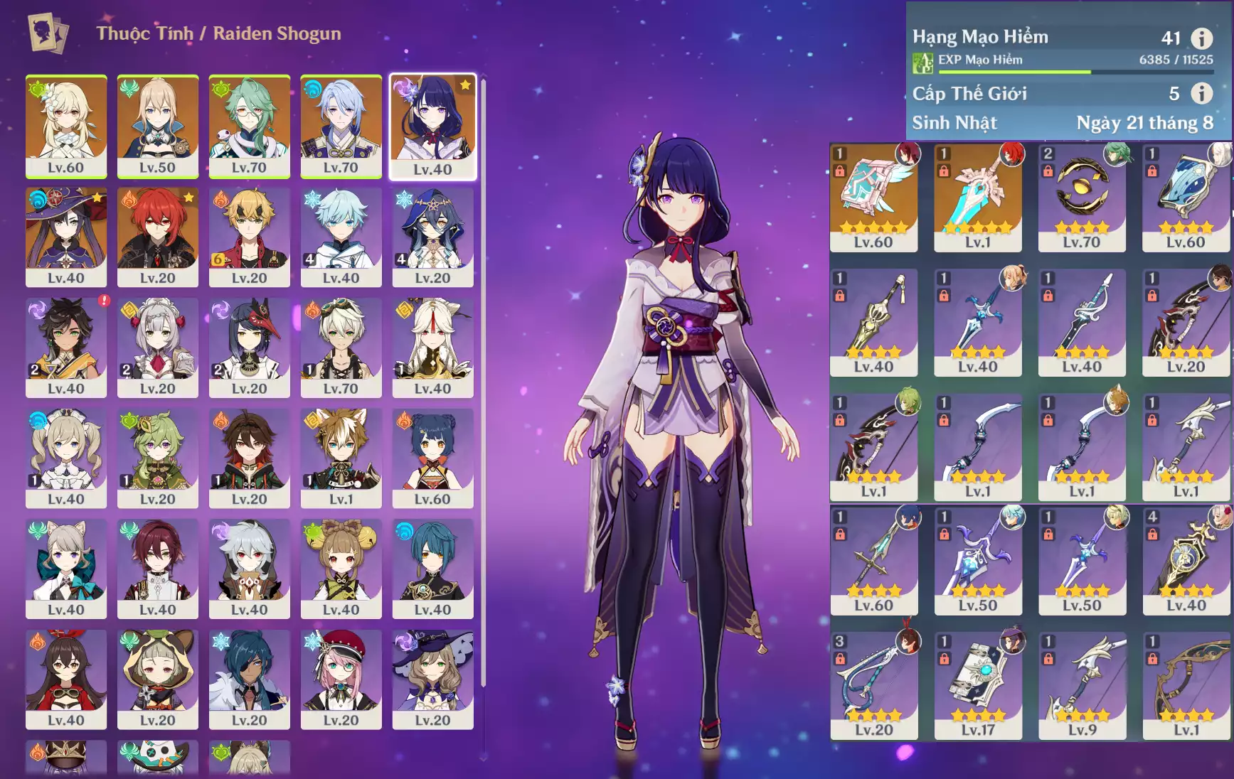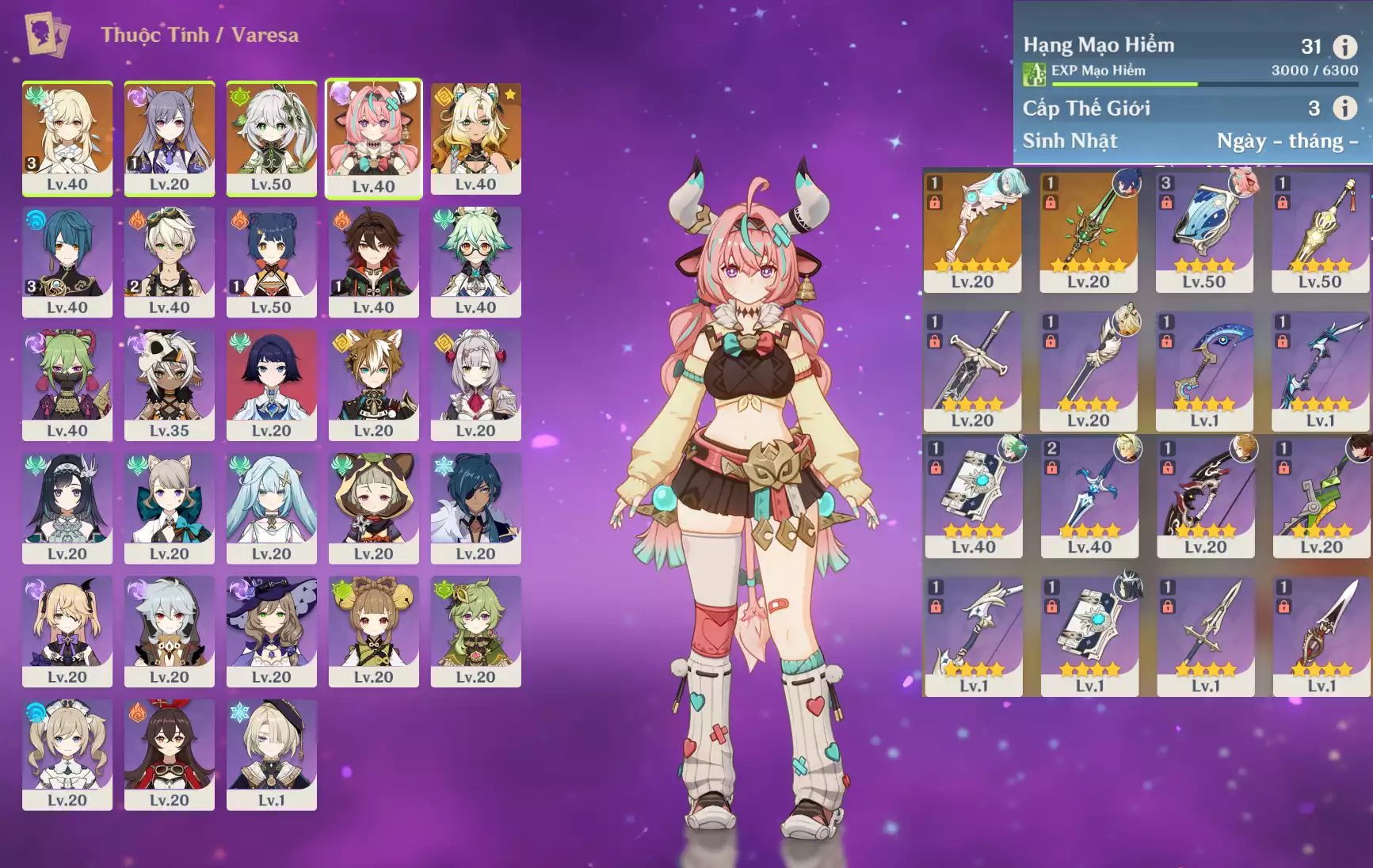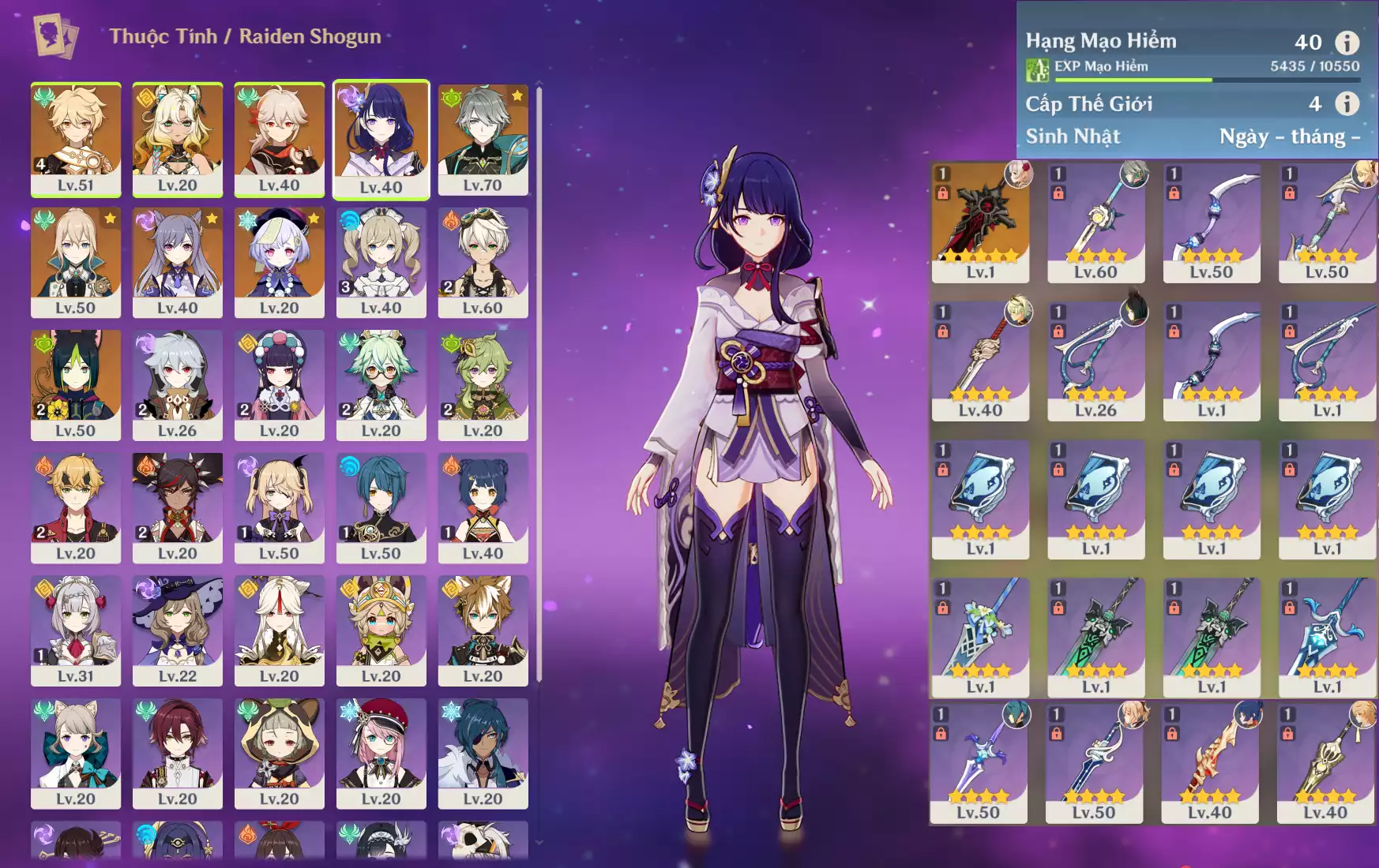 Ar40 : Raidenshogun-baal + Xilonen + Kazuha + Alhaitham + Keqing + TighnariC1 + Jean _ banner nhân vật 15/90 lần ( chưa set user + sinh nhật ) _ map zin 85%