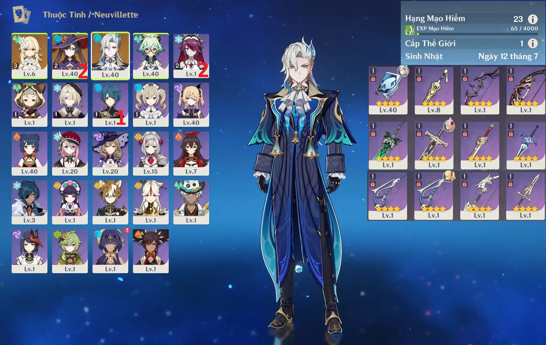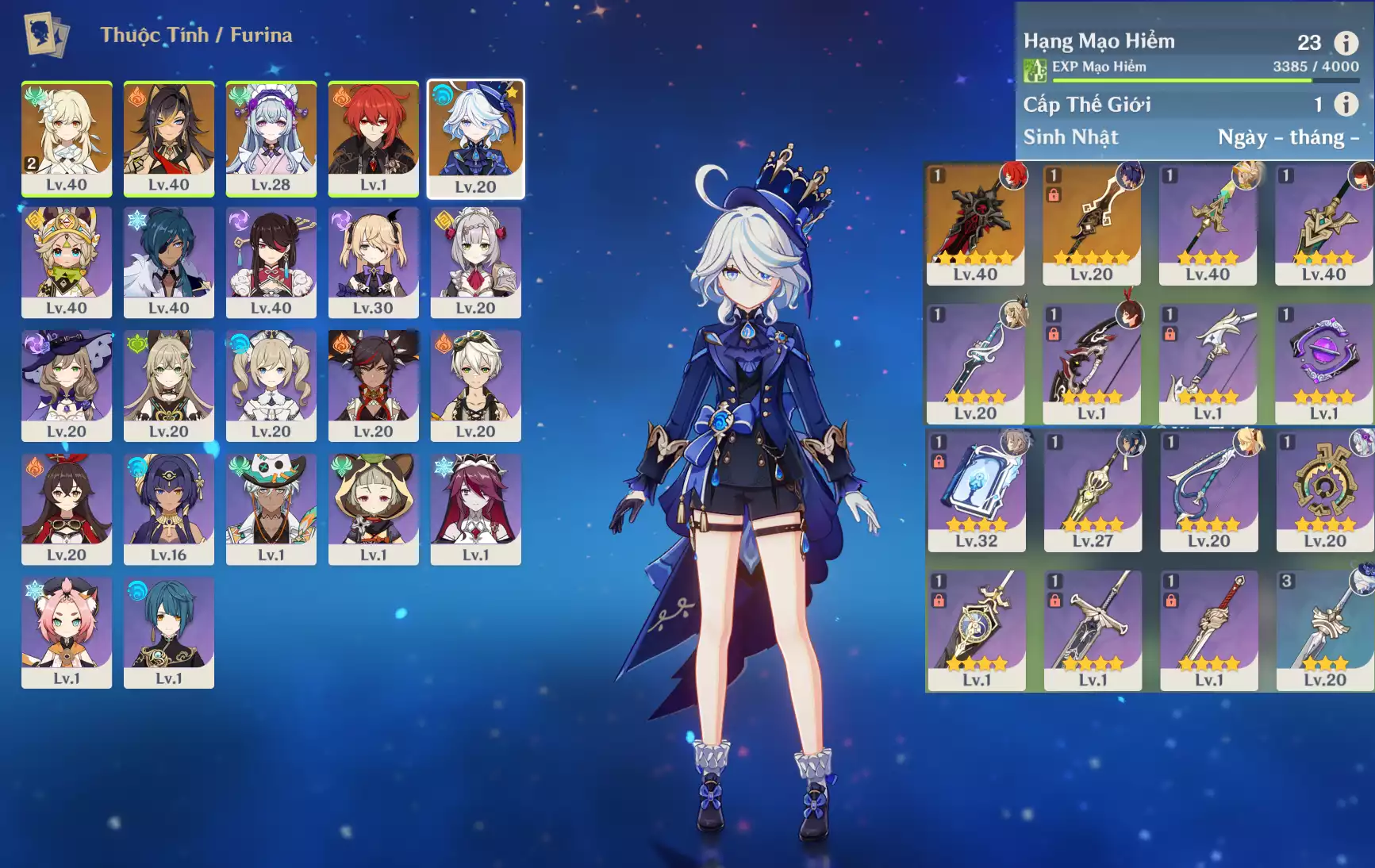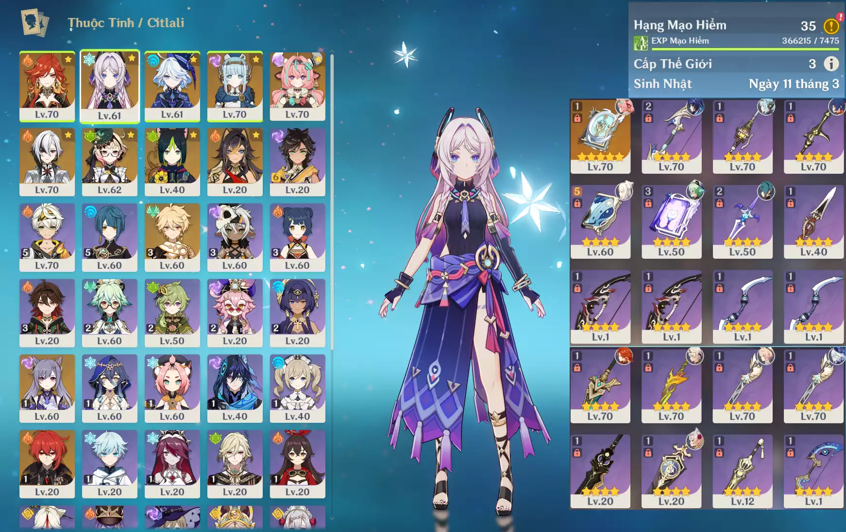 Ar40 : Raidenshogun-baal + Xilonen + Kazuha + Alhaitham + Keqing + TighnariC1 + Jean _ banner nhân vật 15/90 lần ( chưa set user + sinh nhật ) _ map zin 85%