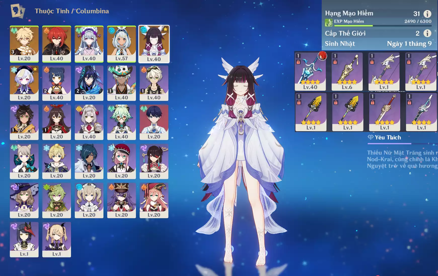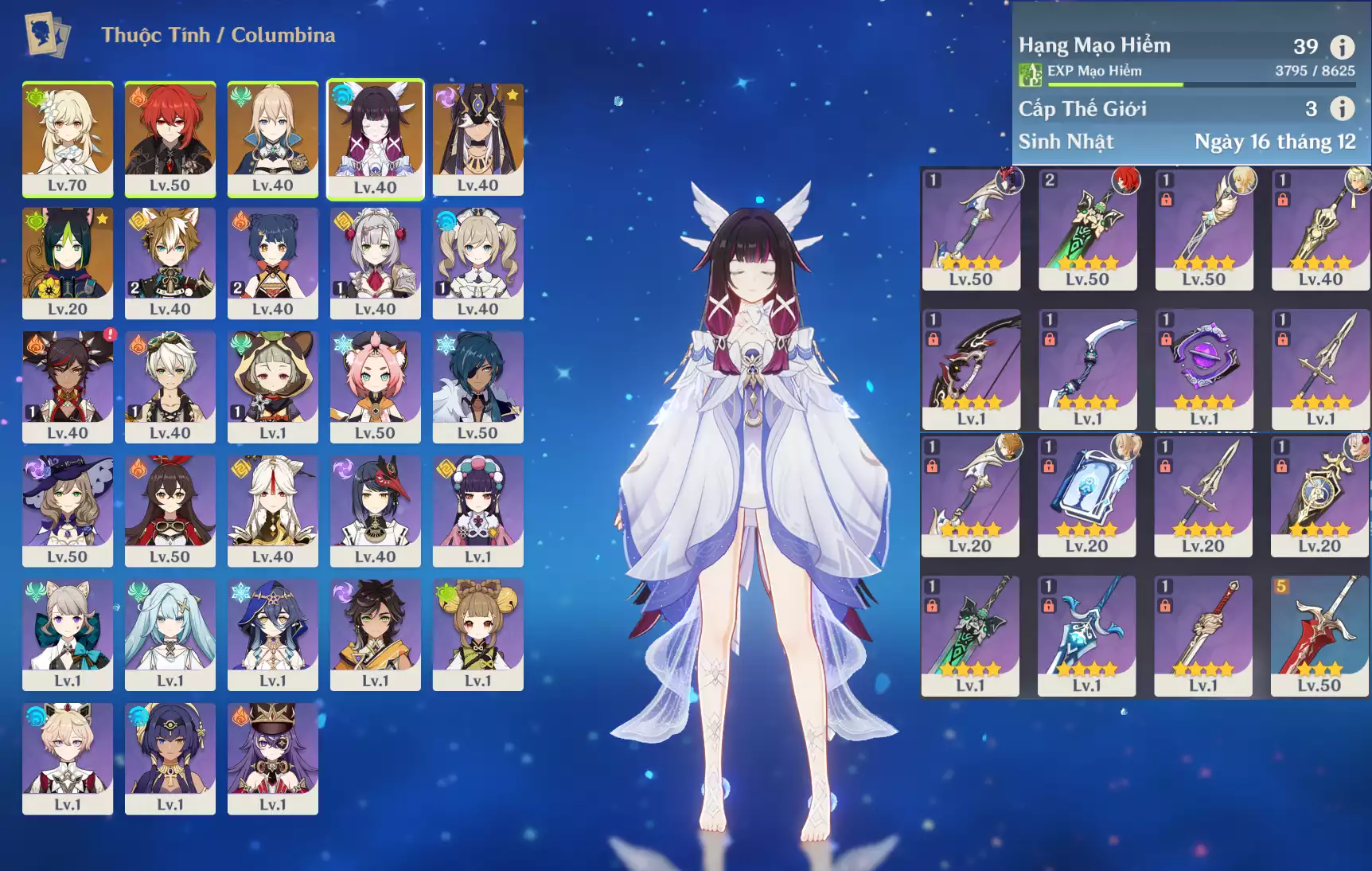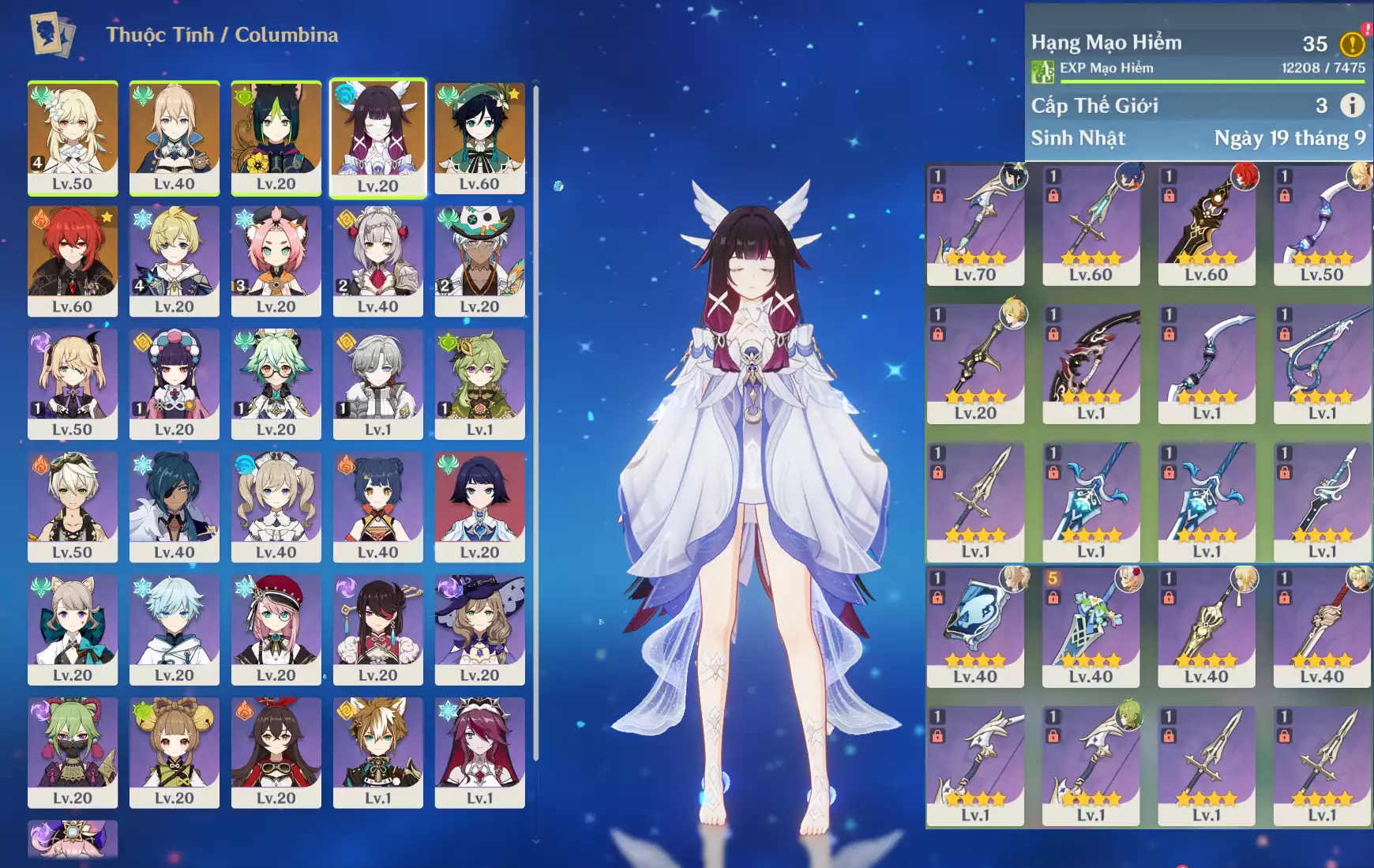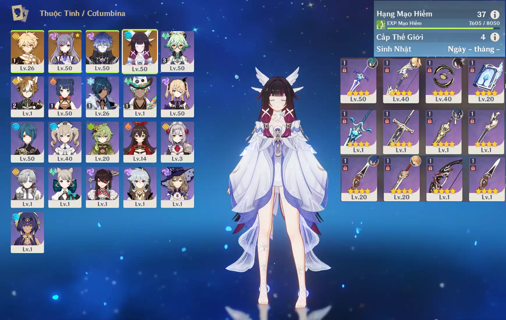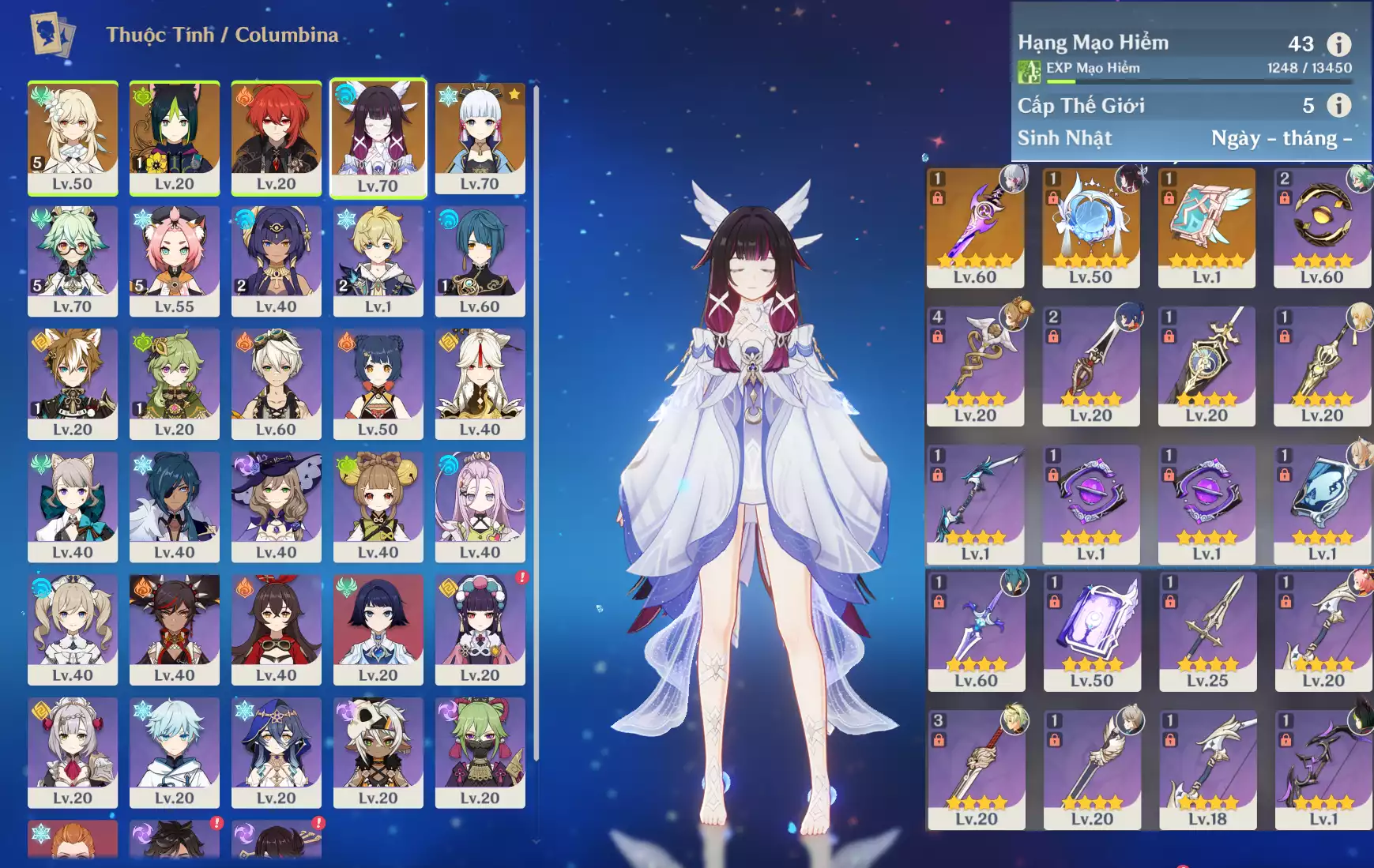Ar43 : Columbina*Trấn ( DKHM ) + Ayaka*Trấn ( ASĐSM ) + TighnariC1 _ banner nhân vật ĐÃ LỆCH 4 trang ( acc trắng thông tin _ chưa set email + sinh nhật ) _ map zin 95%.