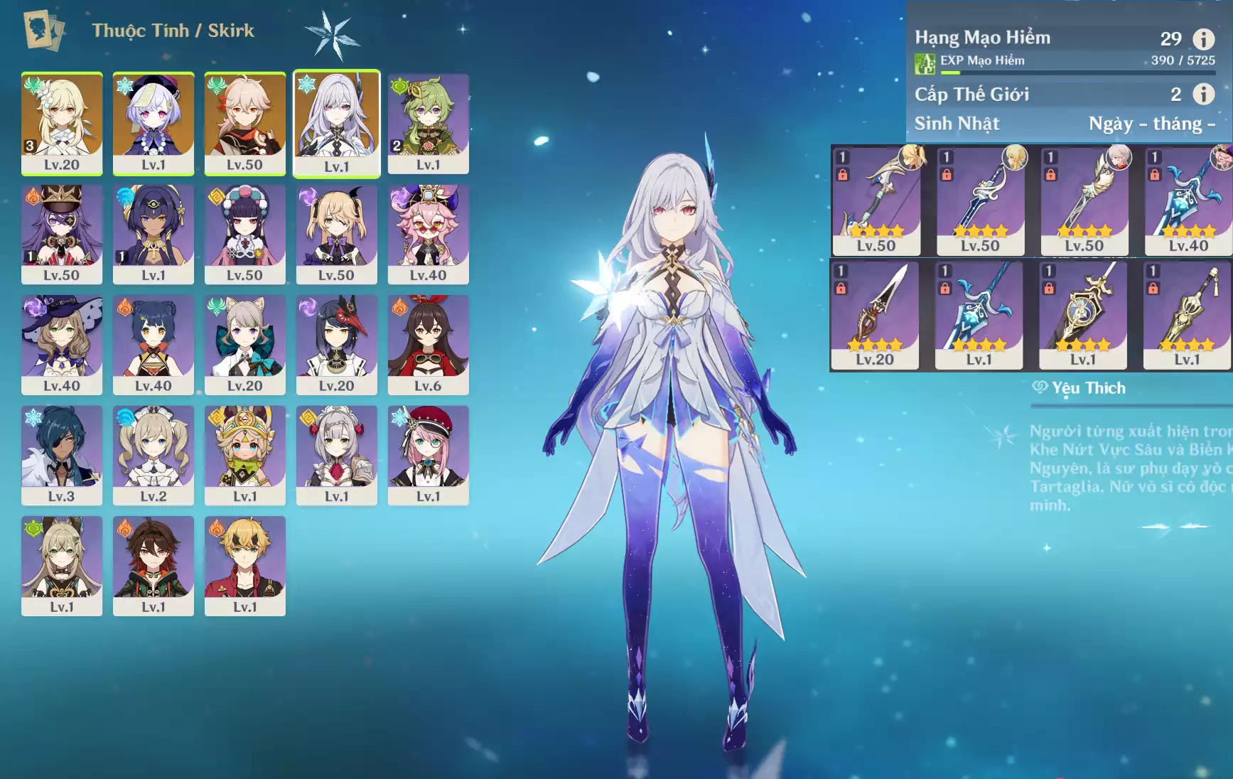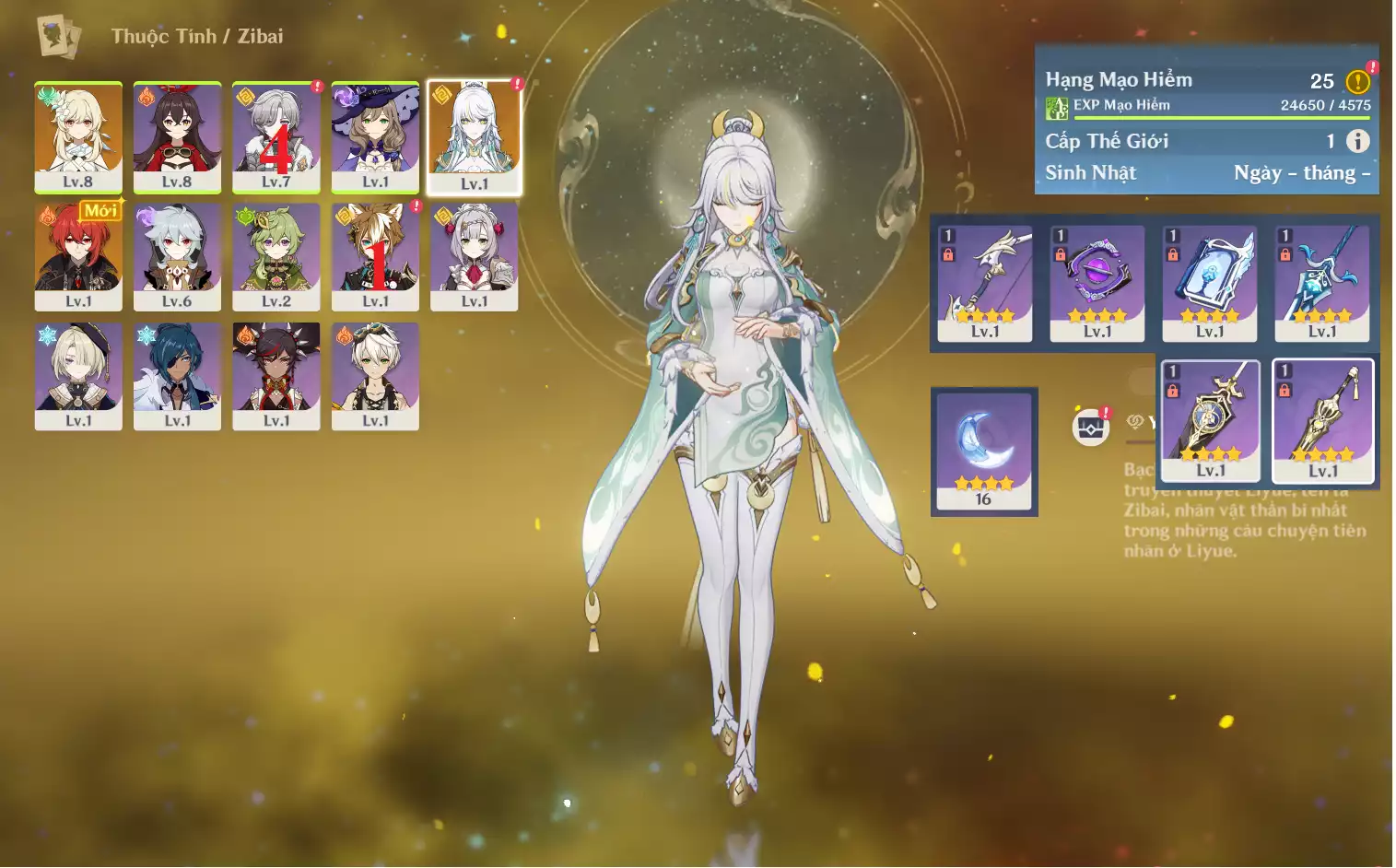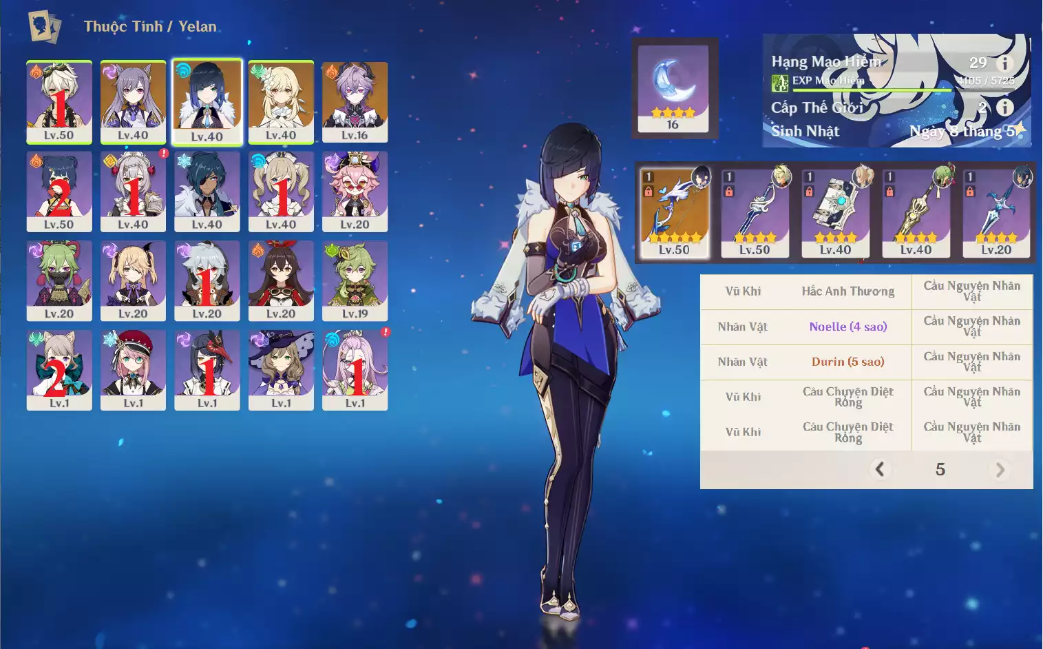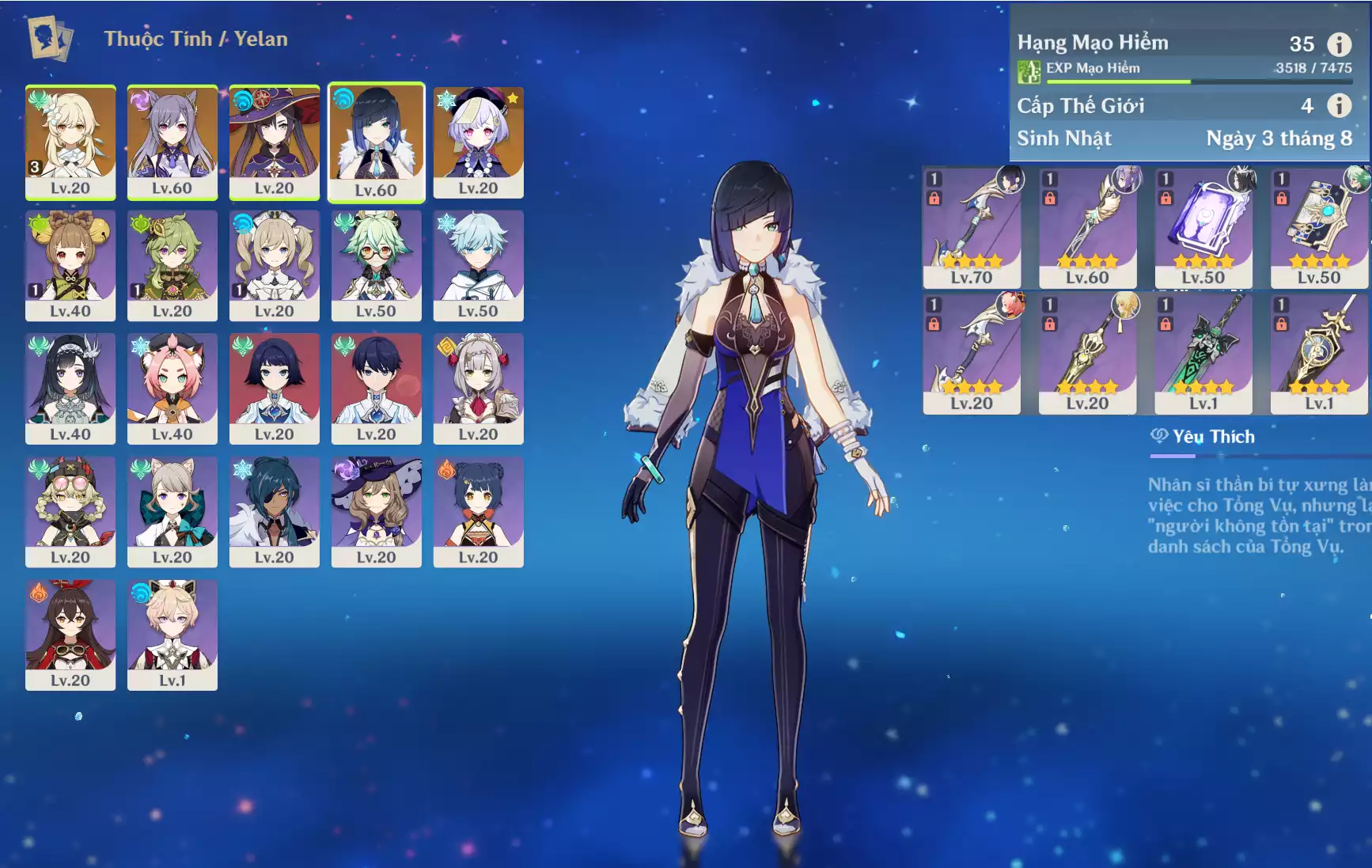 #360831 250,000đ 250,000đ AR level 35 Khu Vực asia Tướng 5* 4 Ar35 : Yelan + Keqing + Mona + QiQi _ banner nhân vật ĐÃ LỆCH 30/90 lần ( chưa set user ) _ map zin hơn 95% Tướng : 4 Vũ khí : 0 Chi tiết