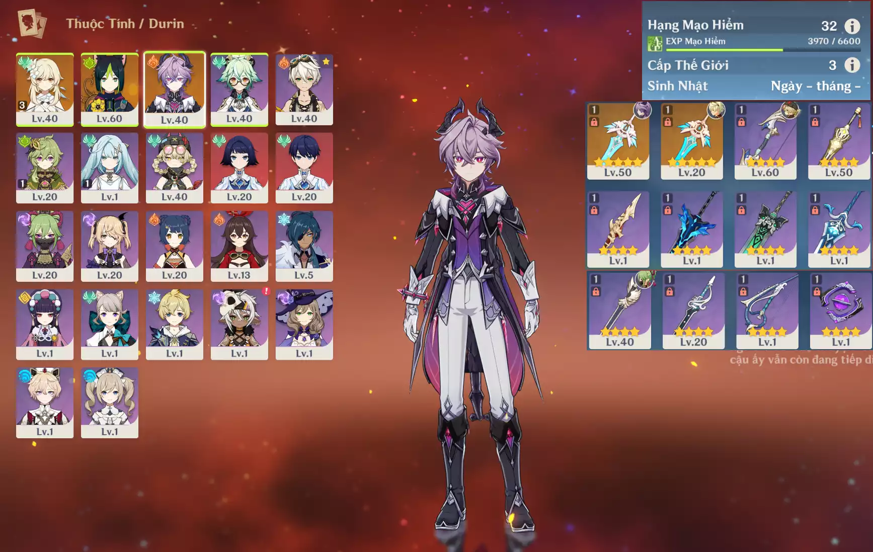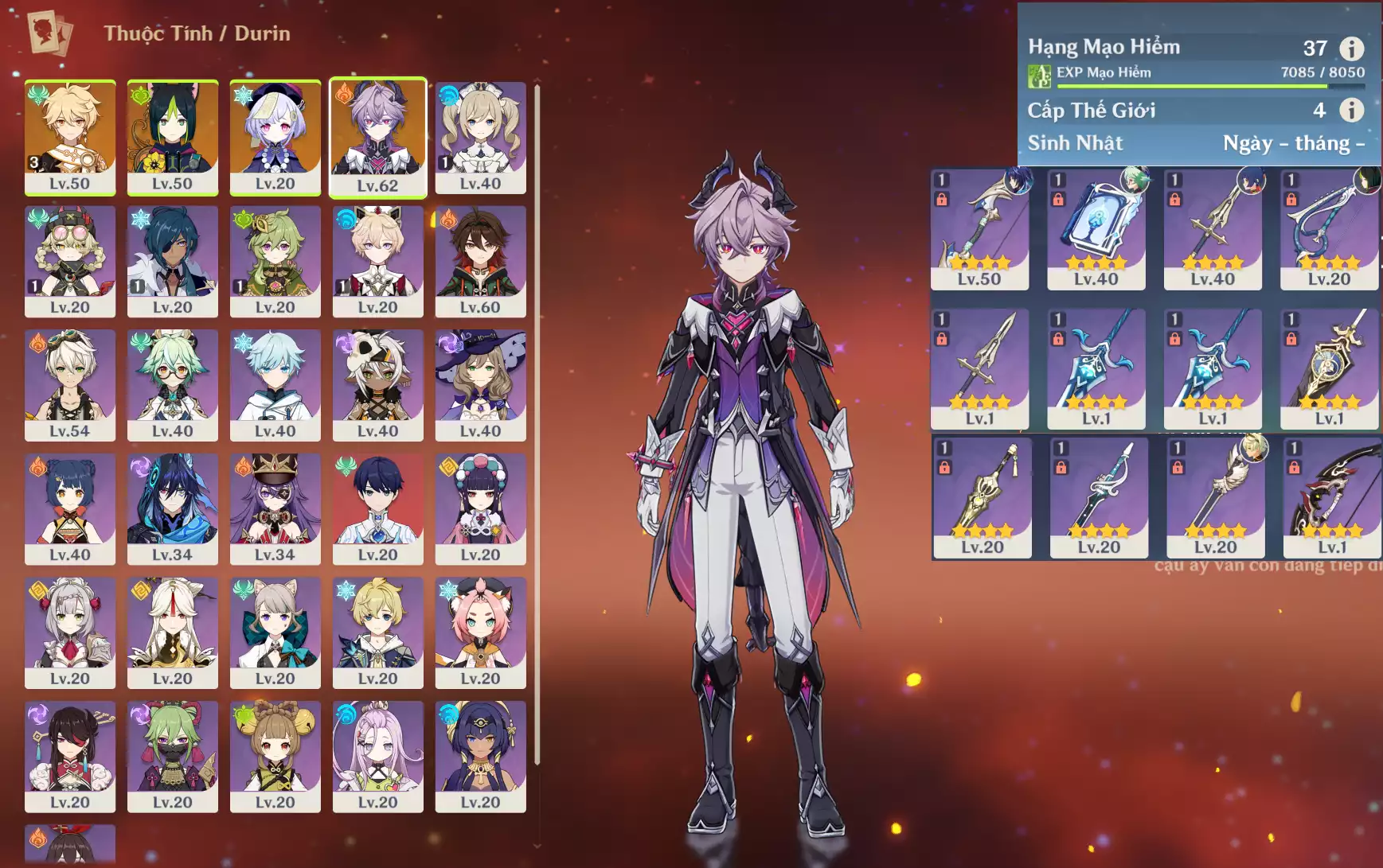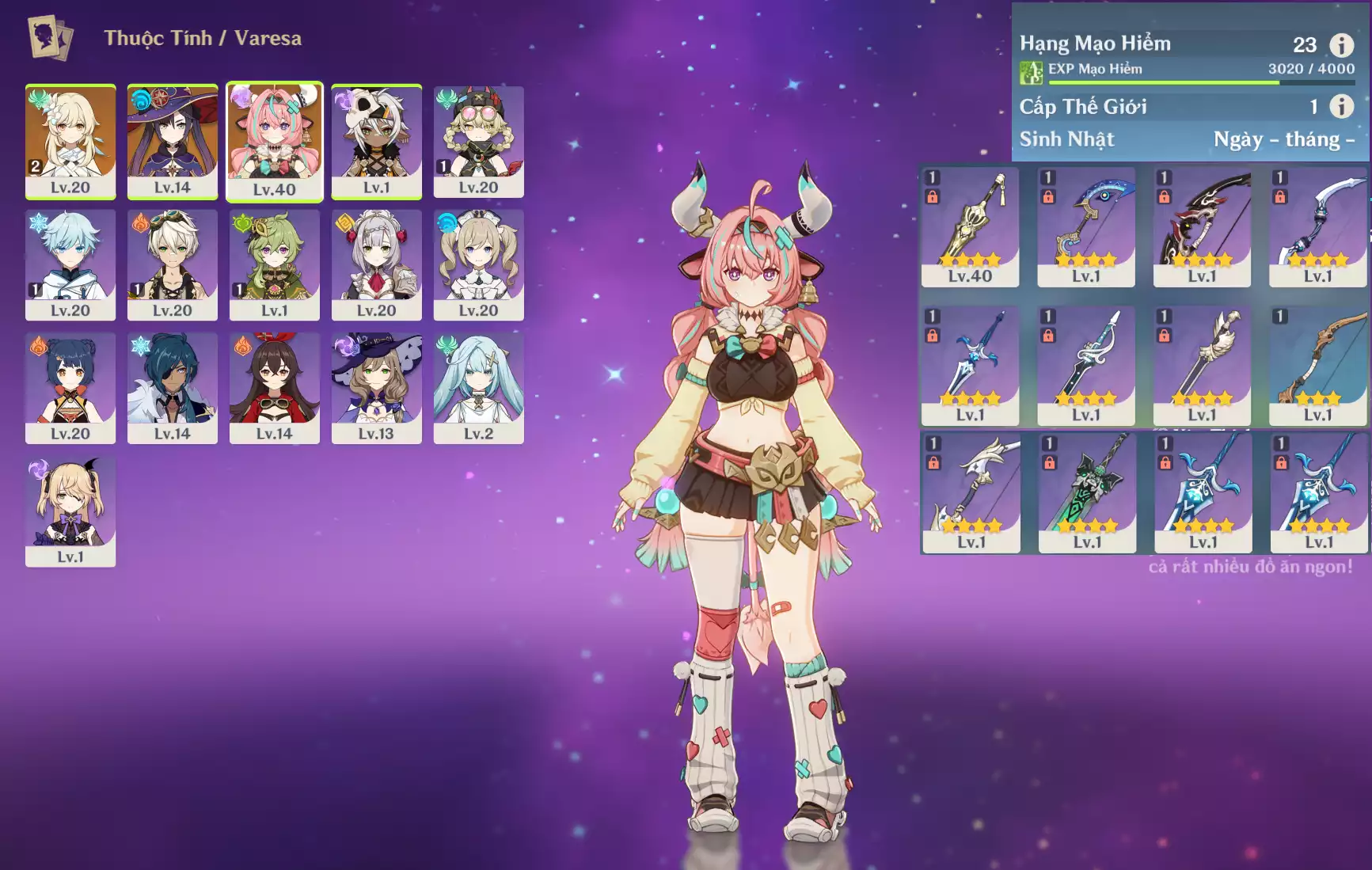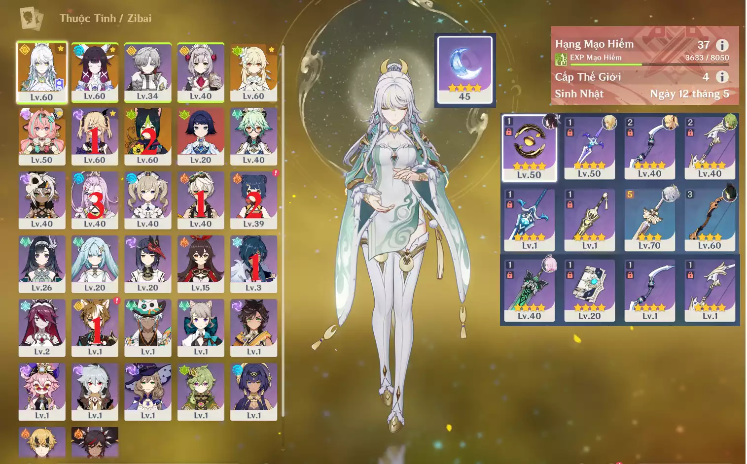 #360837 1,000,000đ 1,000,000đ AR level 37 Khu Vực asia Tướng 5* 5 VIP combo ar37: Columbina + Zibai + Varesa + TighnariCm2 bennetC1 , banner nhân vật 2 trang Tướng : 5 Vũ khí : 0 Chi tiết