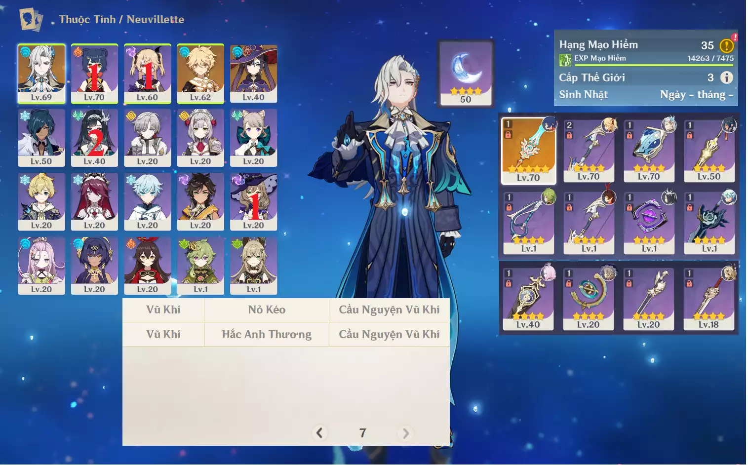 #360839 399,000đ 399,000đ AR level 35 Khu Vực asia Tướng 5* 2 Ar35: Neuvillette + Mona main NAM , banner vũ khí 7 trang, chưa set user _ chưa set sinh nhật , map còn nhiều Tướng : 2 Vũ khí : 1 Chi tiết